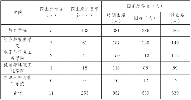 省教育厅、财政厅2024年下达beat365官网名额:国家奖学金11人,国家励志奖学金253人、国家助学金2130人,各学院分配名额如下: