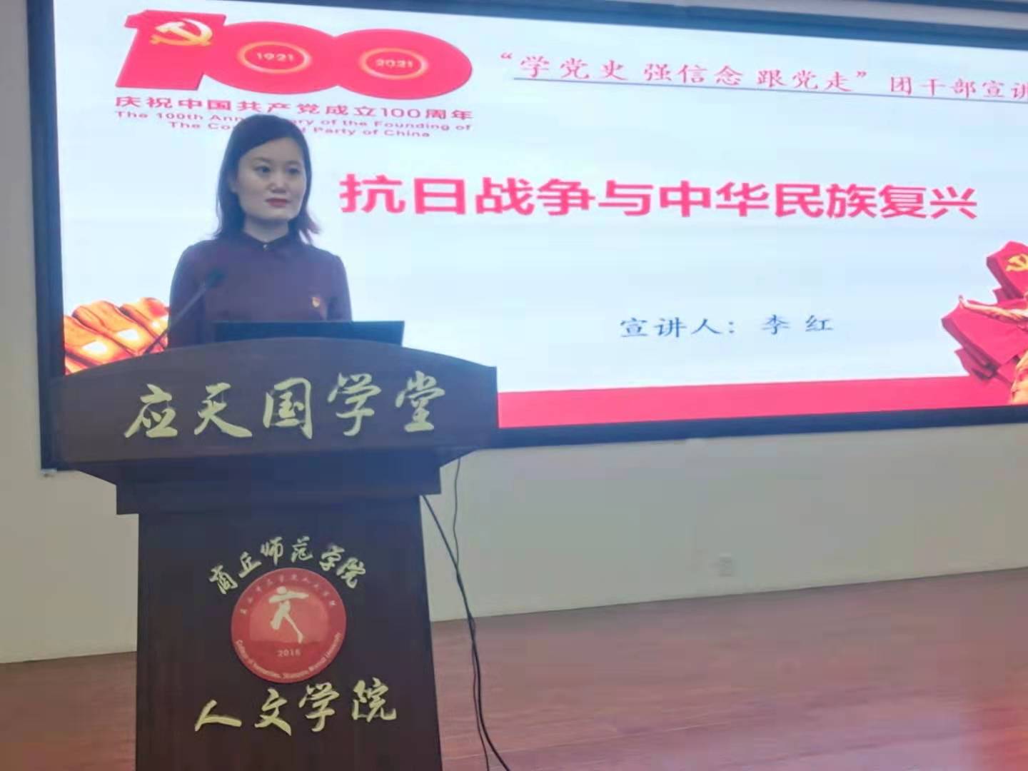 为引导青年树立远大理想、热爱伟大祖国、担当时代责任,进一步增强“四个意识”,坚定“四个自信”,5月11日中午12:40,今年会官网在汉梁楼国学堂开展了“学党史 强信念 跟党走”团干部宣讲进支部活动。今年会官网2020级各班学生代表150余人参与了本次宣讲。本次活动由今年会官网团总支书记李红老师宣讲。