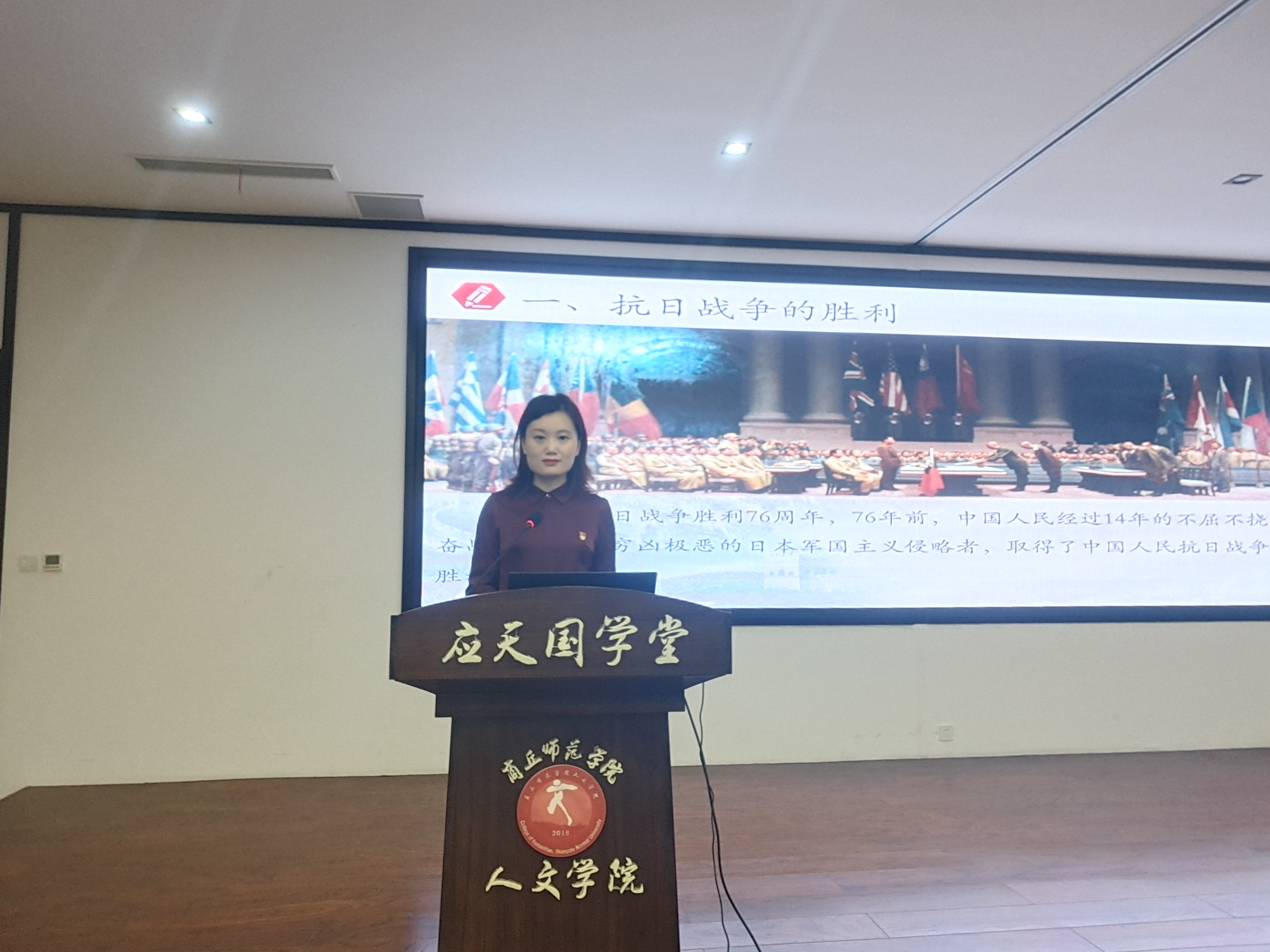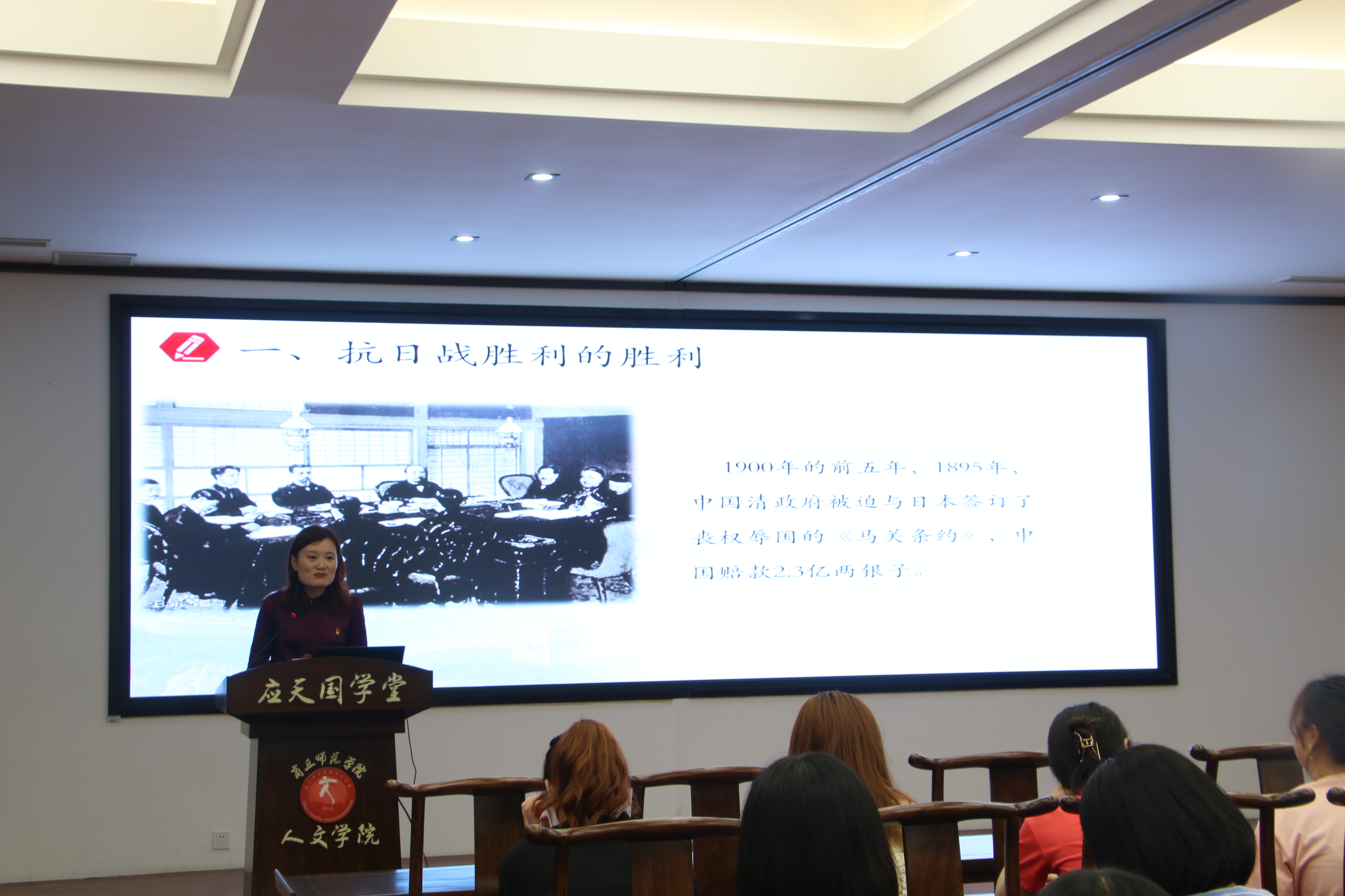 李红老师以《抗日战争与中华民族复兴》为题,带领大家回顾了抗日战争的苦难辉煌历程以及中国人民和中华民族为抗日战争胜利做出的巨大牺牲和贡献。最后,借抗日战争的影响点出民族独立与民族自尊、自信心的重要性。