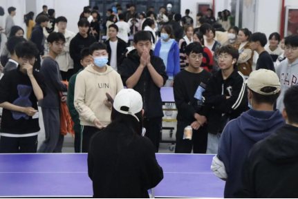 在体育馆二楼的乒乓球比赛场地,比赛还未开始,许多观摩者陪同参赛选手一同进入赛场,为自己的同学加油助威。随着负责人对比赛规则的宣布,比赛正式拉开序幕。选手们的精彩表现使得乒乓球以优美的弧线越过空中,博得了一阵的喝彩。赛事现场进行的热闹有序,每个单项的参赛选手都以最佳的状态在赛场上奋力拼搏。
