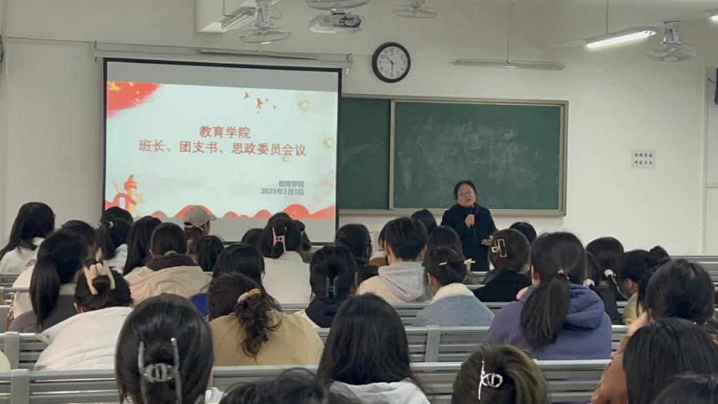 为提高我院学生干部的工作能力和个人素养,加强学生与老师之间的交流,更好地开展今后的学生工作,3月3日下午,教育学院于1教420召开新学期第一次班长、团支书、思政委员工作会议,会议由我院团总支书记黄莹莹老师主持,孟向红院长、辅导员老师陈慧慧、许海涛及2022级49个班班长、团支书和思政委员参加。