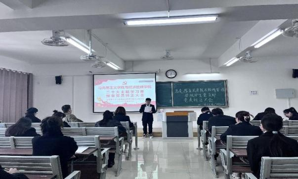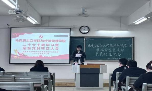4月7日中午,马克思主义学院与经济管理学院学生支部于2教422召开二十大主题学习暨党员转正大会,讨论预备党员刘恩惠、闫瑞同志转正事宜。学院党总支书记助理、团总支书记叶赵强同志特邀参会,经济学学生支部书记员禹辛、青年委员王绎程、管理学学生支部书记石园园、青年委员张雨停及学生支部83名党员参会。大会由学生党支部组织委员刘良晨主持。