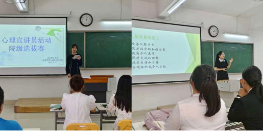 比赛中,参赛选手结合制作的PPT从人际沟通、情绪调节与管理、个性心理等方面进行宣讲。选手们意气风发,在短短的几分钟时间里,表现的思路清晰,表达流畅,直切心理问题。有的以成长轨迹为起点,结合个人经历论述心理健康的重要性,以情感人,以理服人。宣讲比赛所讲内容贴近学生、贴近实际、贴近生活,角度新颖,观点多元,视野开阔。比赛现场气氛活跃,参赛选手们的精彩表现,不时响起阵阵掌声。最终我们选出四名同学代表我院参加校级决赛,分别是张甜桃、范红玲、赵凯丽、汤雯雯。