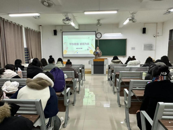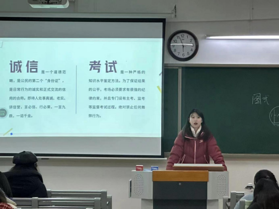 会议上,辅导员们结合班级情况,利用PPT为同学们讲解了诚信考试的重要性,指出诚信是中华民族的传统美德,也是每个学生应当遵守的行为准则。考试是检验同学们学习成果的重要方式,同时也是检验同学们道德品质的试金石,引导同学们正确看待期末考试。辅导员们告诫大家,在考试中,诚信不仅是对自己学业的尊重,更是对他人努力的认可,只有坚持诚信原则,才能树立良好的学风、考风,促进公平竞争。倡导同学们以实际行动践行诚实守信,把考试作为检测学习成效的重要途径,达到以考促学、以考促行。