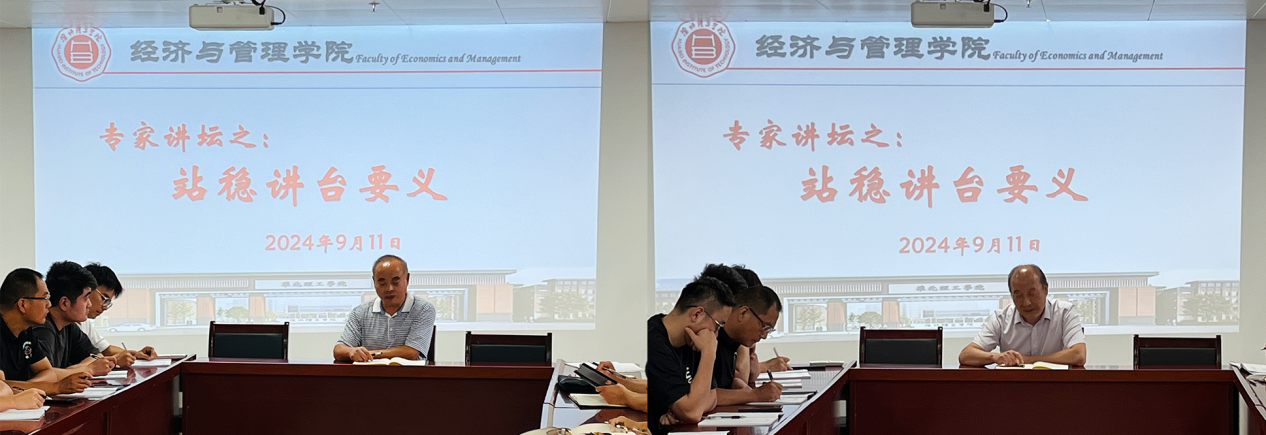 为推动青年教师教学水平提升,助力其更快适应并“站稳”讲台,经济与管理学院于2024年9月11日下午在725室举办首场专家讲坛---“站稳讲台要义”,学院银龄专家代凤礼和徐公伟两位教授作讲坛主讲人开讲,进行教学经验分享、助力青年教师成长。活动由院长吴玲主持,学院全体教师参加。