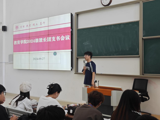 为提高班长和团支书的组织管理能力,发挥优秀学生干部的带头作用,促进学院工作有序开展。9月27日中午12时,教育学院在一号教学楼121教室组织召开2024级学生班长、团支书会仪。本次会议由教育学院团总支书记许海涛主持,2024级全体新生辅导员以及2024级全体班长、团支书参会。