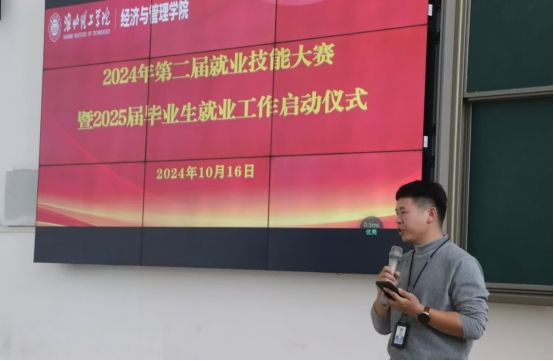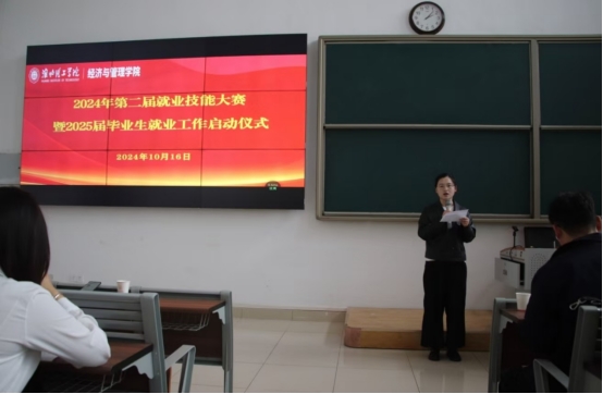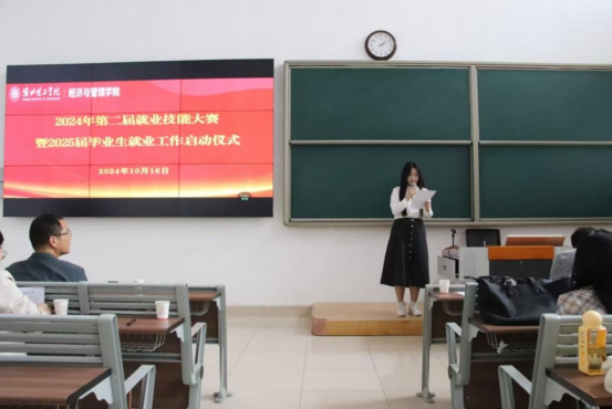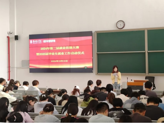 为进一步增强我院学生的就业竞争力,提升职业素养与实践能力,促进理论知识与就业市场的深度融合,经济与管理学院于10月16日下午在一教121开展“第二届就业技能大赛暨2025届毕业生就业工作、校企合作月启动仪式”。学院党总支书记、院长吴玲,书记助理叶赵强,各专业教研室主任、毕业班辅导员以及全体2025届600多名毕业生参加本次活动,处长助理李魏代表学生处(就业处)参加了启动仪式。本次活动分两场分别由郑凡和范红玲主持。