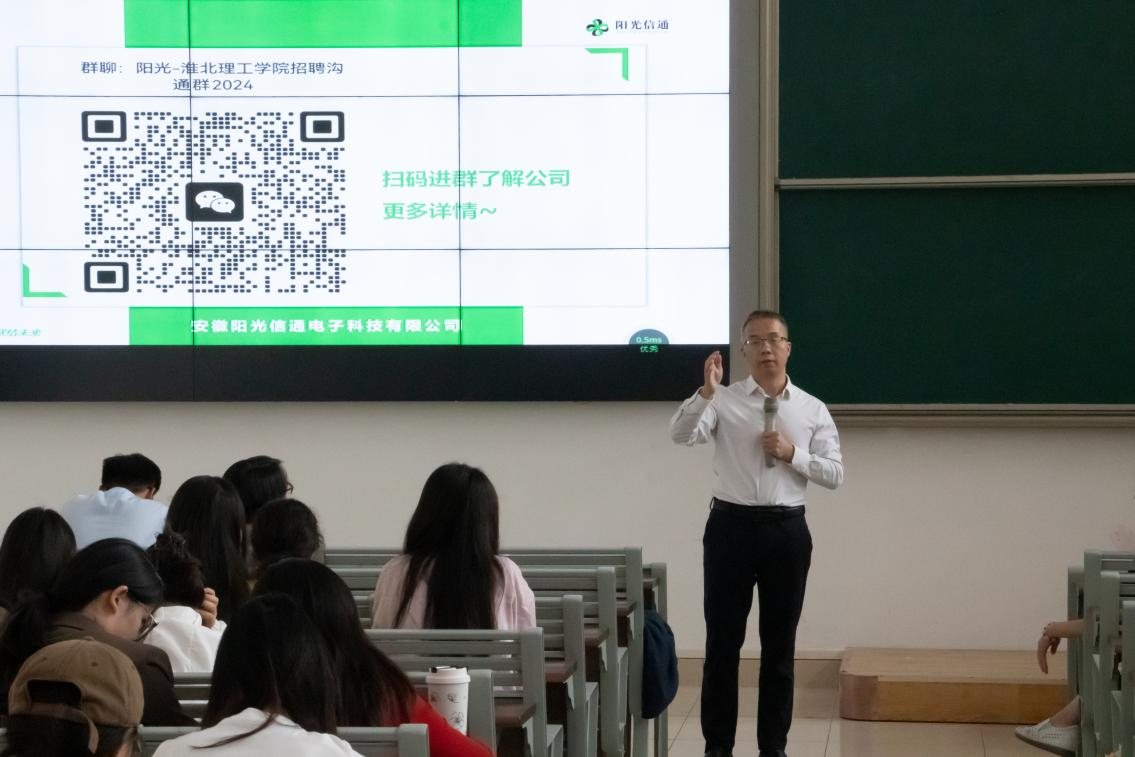 在校企合作月的启动仪式上,首场企业进学院的校园宣讲和双选活动——安徽阳光信通电子科技有限公司专场活动成功举办,学院300余名师生参加本次专场活动。