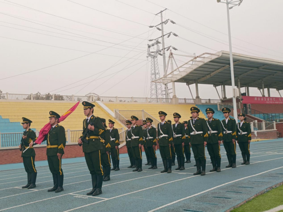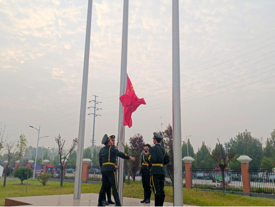 随后,国旗护卫队迈着整齐的步伐,护送着鲜艳的五星红旗走向升旗台。在激昂的国歌声中,五星红旗冉冉升起,全体师生肃立,向国旗行注目礼,表达对祖国的无限热爱和敬意。