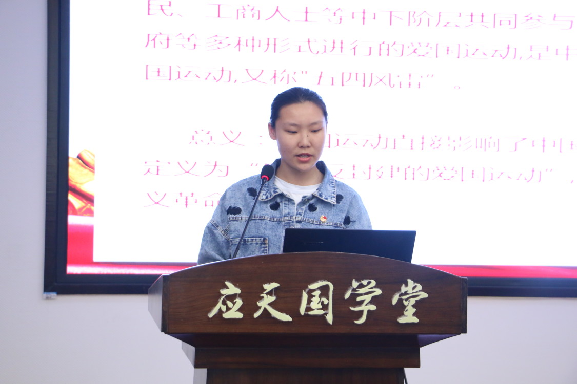为深入学习贯彻习近平总书记在党史学习教育动员大会上的重要讲话精神,激励和引领新时代青年了解党的光辉历史、感悟党的初心使命、领会党的创新理论、体会党的精神谱系、传承党的红色基因,坚定不移跟党走中国特色社会主义道路,实现中华民族伟大复兴的中国梦,2021年5月7日下午1点,今年会官网在汉梁楼国学堂开展了“百年峥嵘,青春五四”暨“党史百日学”主题交流活动。今年会官网团总支书记李红、今年会官网团总支学生会各组织、队伍学生代表参加活动。