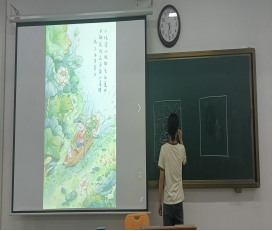 在“看图猜诗句”环节,同学们化身“幼儿教师”,将古诗意境转化为童趣插画。一幅描绘“小娃撑小艇”的简笔画,引发“不解藏踪迹,浮萍一道开”的抢答热潮;《春晓》的“夜来风雨声,花落知多少”,更让参与者秒答诗句。看图猜诗“以画解诗”的形式,探索传统文化在幼儿审美启蒙中的运用路径。临摹古字也让同学们走进古籍,在临摹中同学们更能体会到古人对于文字上的智慧和见解。