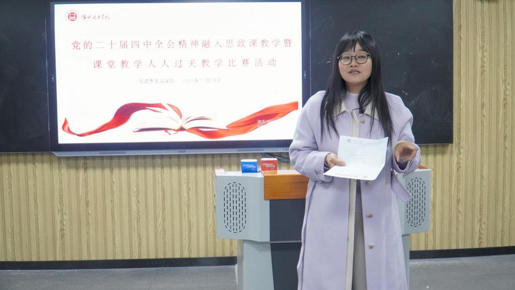 为深入学习贯彻党的二十届四中全会精神融入思政课教学、落实新时代教师队伍建设要求及学校“教学规范年”安排,全面提升思政课教师教学能力,马克思主义学院于11月14日举办党的二十届四中全会精神融入思政课教学暨“课堂教学人人过关”教学比赛活动。活动由学院副院长刘奔前主持,特邀淮北师范大学马克思主义学院阳勇、柳丽教授及学院银龄教师组成专家评委组,学院全体青年教师参赛。