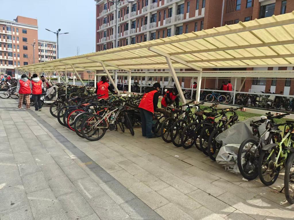 面对随意停放、歪斜倾倒的自行车与电动车,志愿者们分工协作、有条不紊,轻轻扶起倒地车辆,将超出停车线的车辆逐一归位,按照车型分类排列,细心调整车头朝向、对齐车尾、均匀间距,让原本杂乱的停车区域变得整齐划一。部分志愿者还拿出自带的抹布,擦拭车把、车身的灰尘,用点滴行动守护校园洁净。