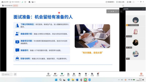 3月9日至15日,就业指导主题班会在各班级教室有序开展,毕业班学生通过腾讯会议同步参与。辅导员围绕就业形势分析、简历制作、面试技巧等内容进行系统讲解,并结合活动一中征集的优秀视频进行案例教学。本次班会覆盖学生669人,现场互动频繁、气氛热烈,帮助同学们在真实经验中汲取力量,在专业指导中明晰方向,真正实现了“职场初探,经验共享”的活动初衷。