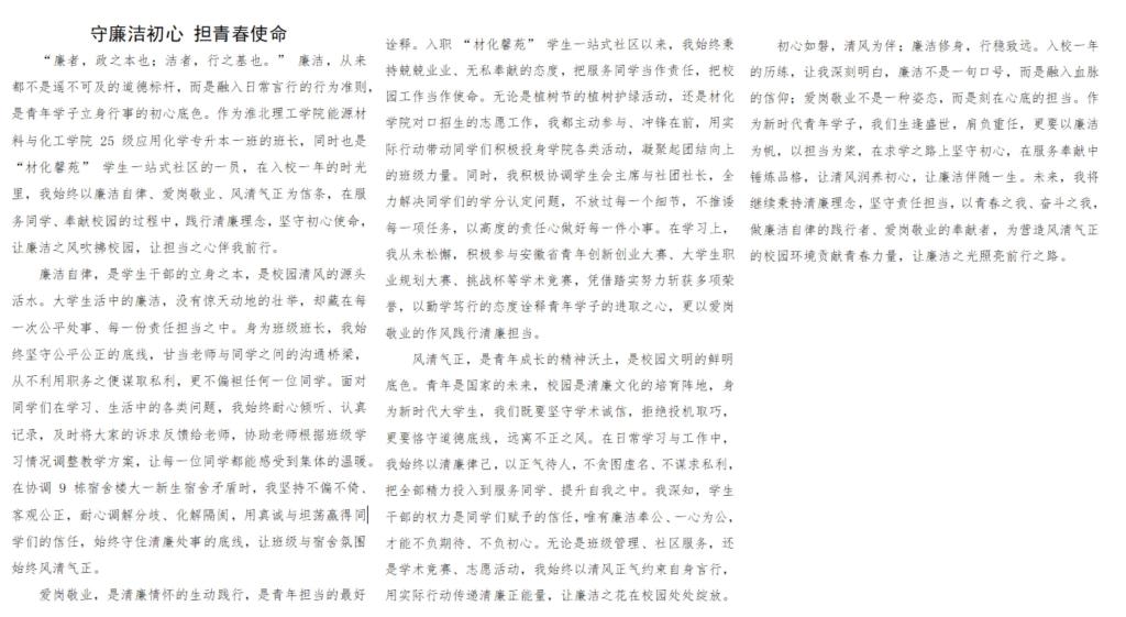 学院发起“廉心润初心,奋进新征程”廉政感悟征文活动,鼓励全院师生结合自身经历、工作学习实际,撰写廉政感悟、心得体会。活动得到师生积极响应,大家踊跃投稿,用文字表达对廉政建设的理解、对廉洁修身的追求,作品内容真实、情感真挚,既有对廉政理念的深刻阐释,也有对自身廉洁自律的严格要求,进一步凝聚了崇廉、尚廉、守廉的思想共识。