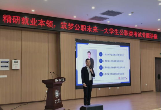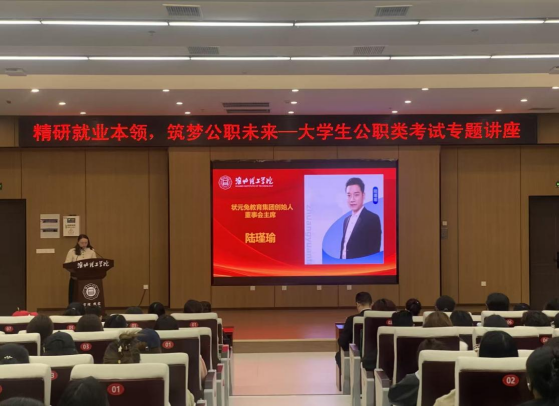 为深化就业育人工作,提升学生应试能力与就业质量,4月8日下午,经济与管理学院联合状元兔教育科技集团,在学校图书馆报告厅成功举办了以“精研就业本领,筑梦公职未来”为主题的大学生公职类考试专题公益讲座。本次讲座特邀状元兔教育股份有限公司创始人、董事会主席陆瑾瑜担任主讲嘉宾,状元兔教育相关负责人、学院领导及教师代表,与大一至大三有公考意愿的学生共同参与,讲座由辅导员徐瑞鲜主持。