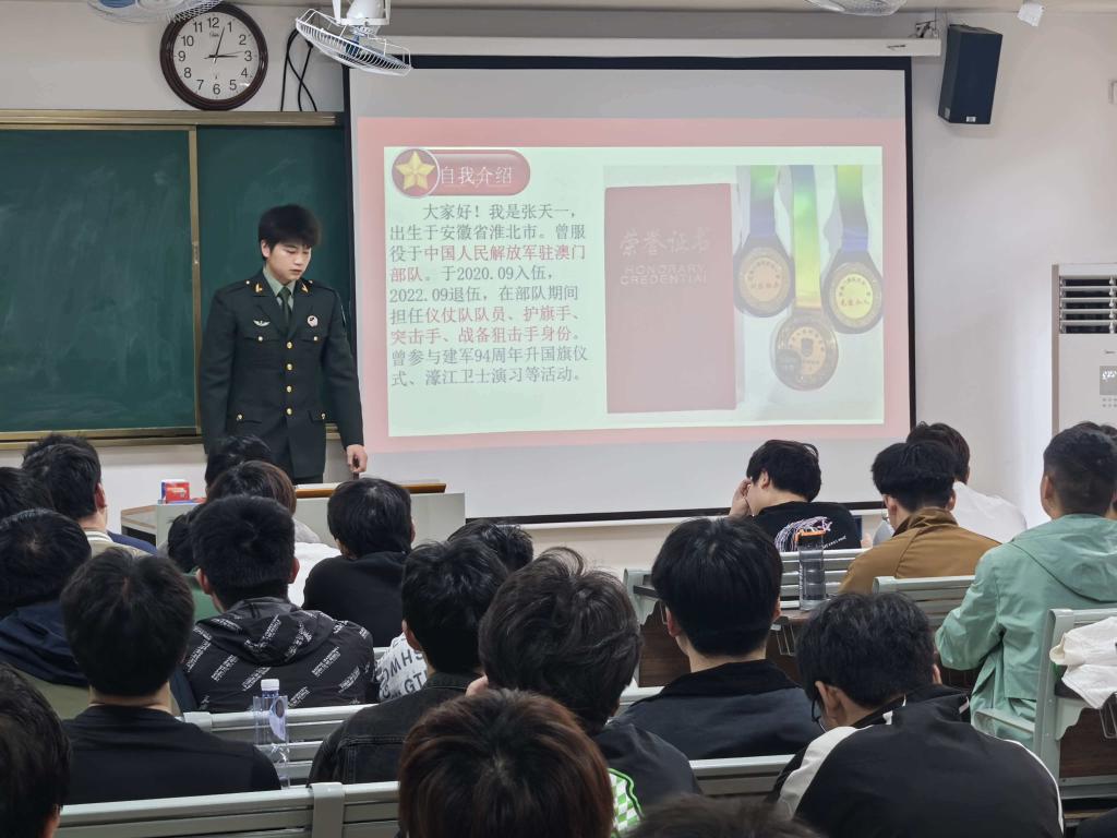 宣讲会上,学院特别邀请院内退伍军人学子进行现场演讲。退伍学子结合自身军旅生涯,用真挚的语言、生动的事例,分享了从军期间的训练、生活、成长经历,讲述了军营磨砺带来的蜕变与成长,详细解读了大学生参军入伍的政策福利、报名流程、身体条件、学业保障等同学们关心的核心内容,让在场学子对参军入伍有了更直观、更全面的认识。他们身上展现出的军人作风、家国担当,深深感染了现场每一位同学,点燃了大家投身军营、报效祖国的青春热情。