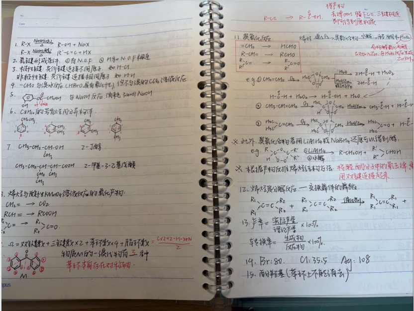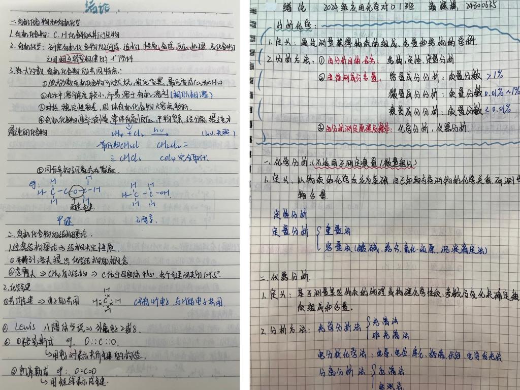 活动自启动以来,得到全院学生积极响应,同学们踊跃参与、精心筹备。参赛笔记聚焦化学专业核心内容,涵盖无机化学、有机化学、分析化学等专业教材,或字迹工整、布局精巧,或重点突出、批注详实,或图文并茂、创意十足,将复杂的化学方程式、实验原理、物质结构等知识点清晰梳理,既展现了化学专业知识的严谨性,也体现了个性化的学习思考,每一页笔记都凝聚着同学们的专注与付出,彰显着新时代学子的治学风采。评选阶段,学院组织专业教师、班主任组成评审小组,坚持公平、公正、公开原则,结合专业特点,从笔记的专业性、完整性、逻辑性、创新性、美观度五个维度进行综合评审,筛选出一批优质笔记,为同学们树立了学习榜样。