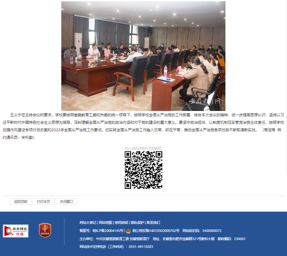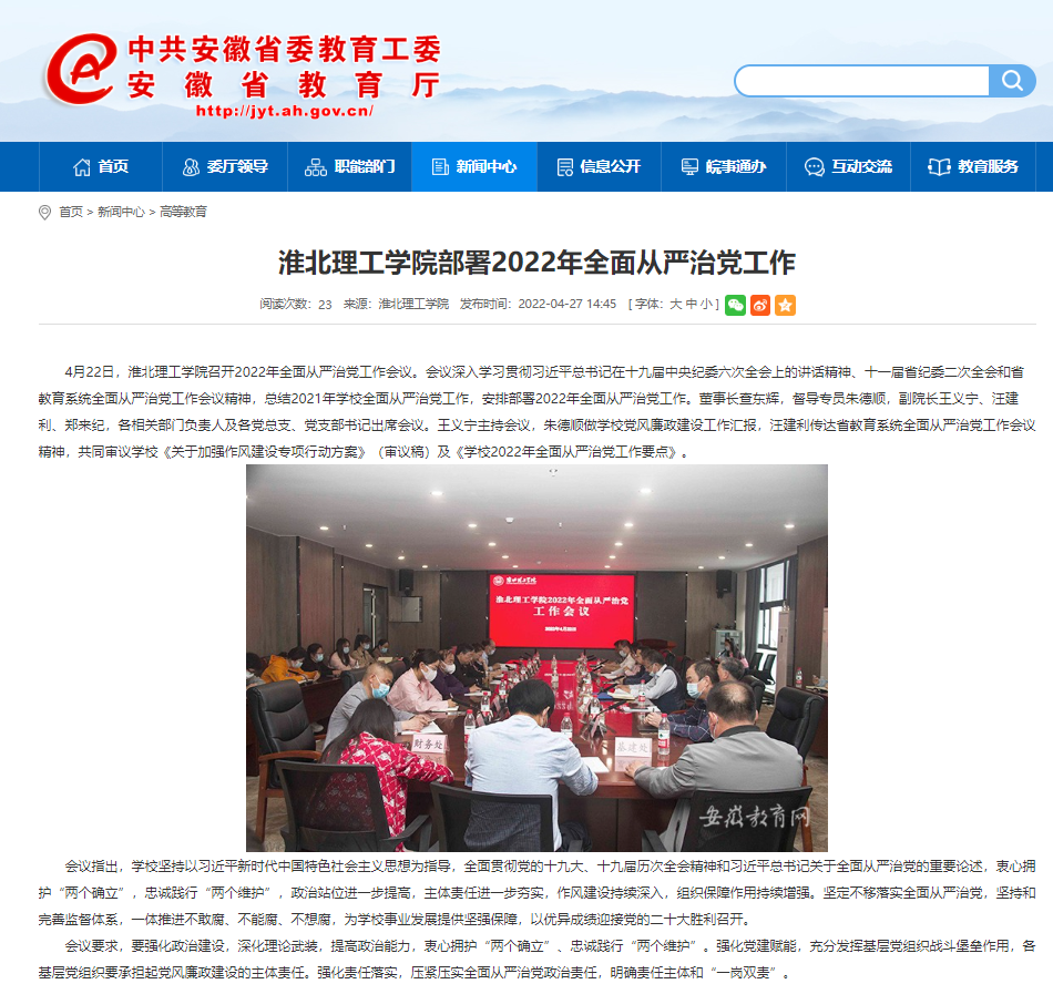 4月22日,beat365唯一官方网站召开2022年全面从严治党工作会议。安徽教育网首页对此进行了报道。