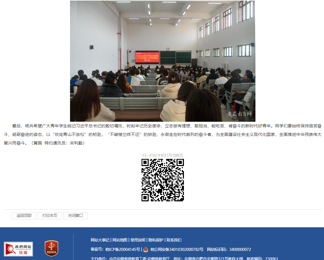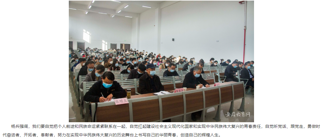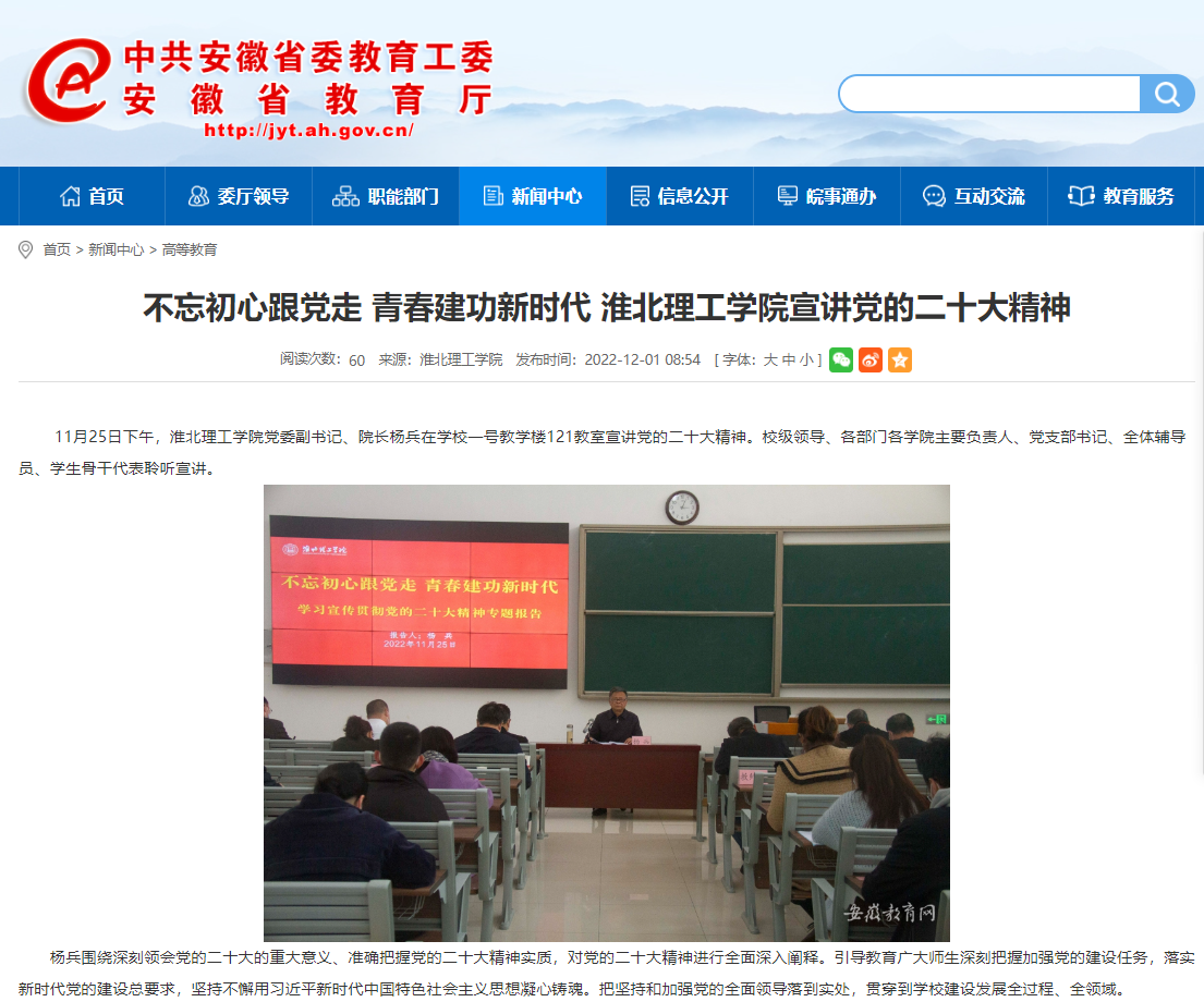11月25日下午,beat365唯一官方网站党委副书记、院长杨兵在学校一号教学楼121教室宣讲党的二十大精神。校级领导、各部门各学院主要负责人、党支部书记、全体辅导员、学生骨干代表聆听宣讲。安徽教育网对此进行了报道。