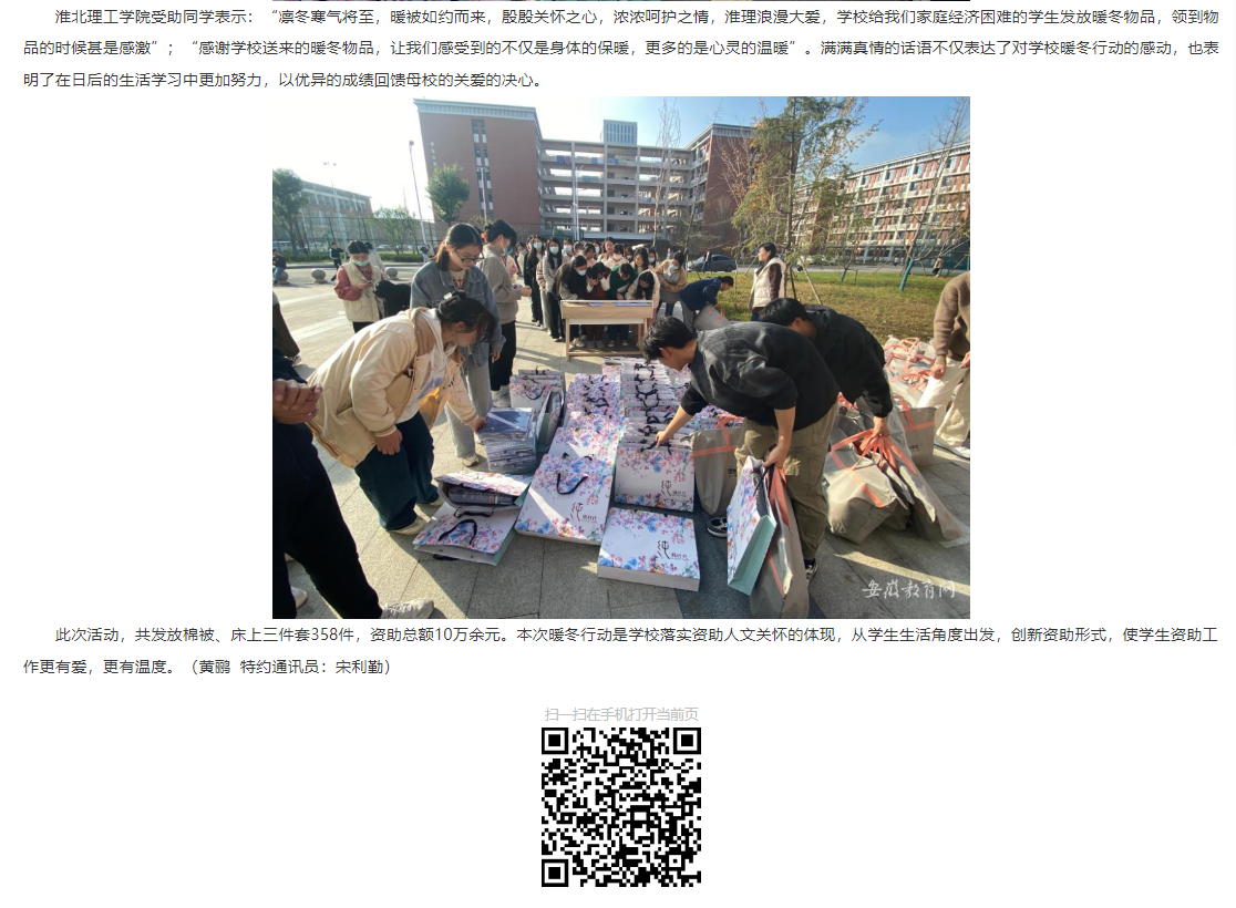 为进一步落实国家和学校学生资助政策,帮助家庭经济困难学生温暖过冬。近日,beat365唯一官方网站开展了“暖冬行动”。学校党委书记朱德顺、副院长郑来纪及相关部门负责人在宿舍楼现场为部分重点保障的家庭经济困难学生发放暖冬棉被、床上三件套等物品。安徽教育网首页对此进行了报道。