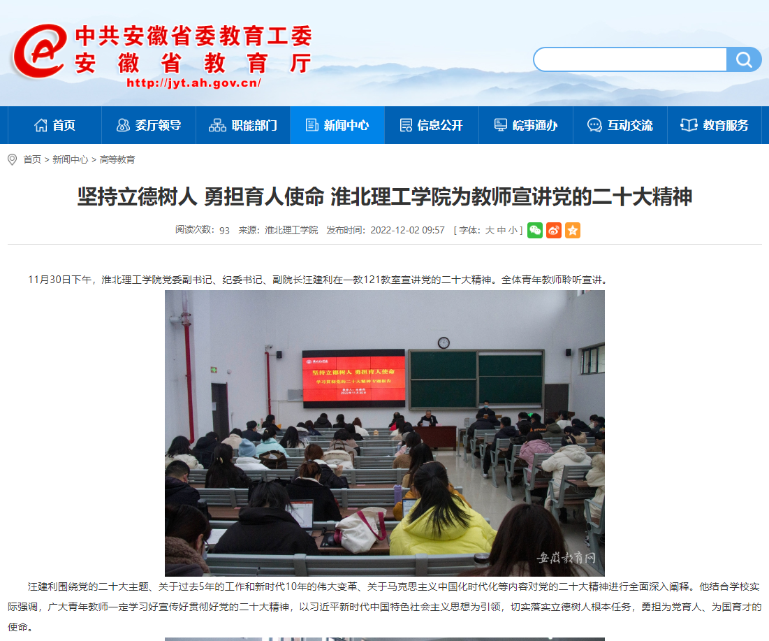 1130日下午,beat365唯一官方网站党委副书记、纪委书记、副院长汪建利在一教121教室宣讲党的二十大精神。全体青年教师聆听宣讲。安徽教育网对此进行了报道。