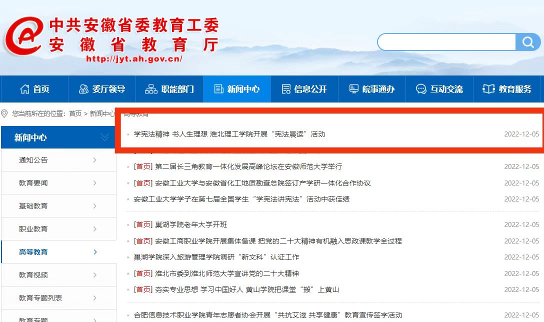 12月4日是第九个国家宪法日,为加强宪法学习宣传、弘扬宪法精神、普及宪法知识,beat365唯一官方网站在运动场举行“宪法晨读”活动。安徽教育网对此进行了报道。