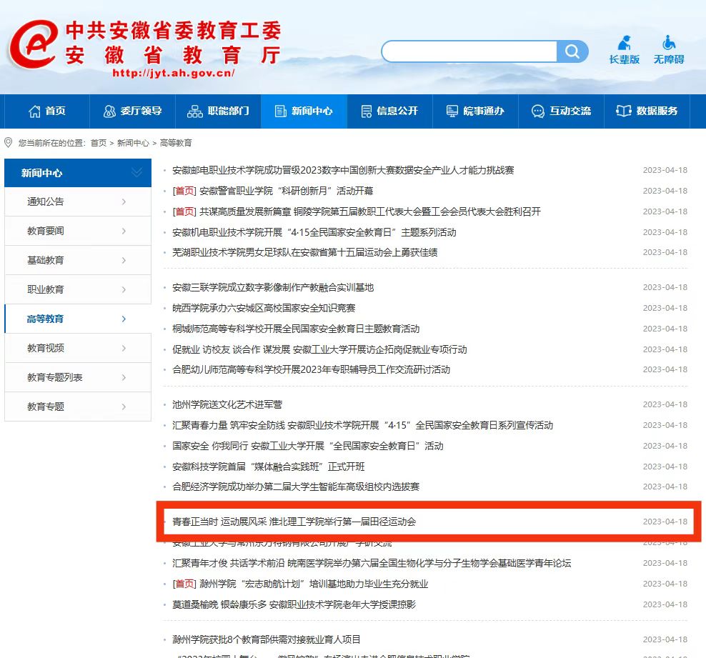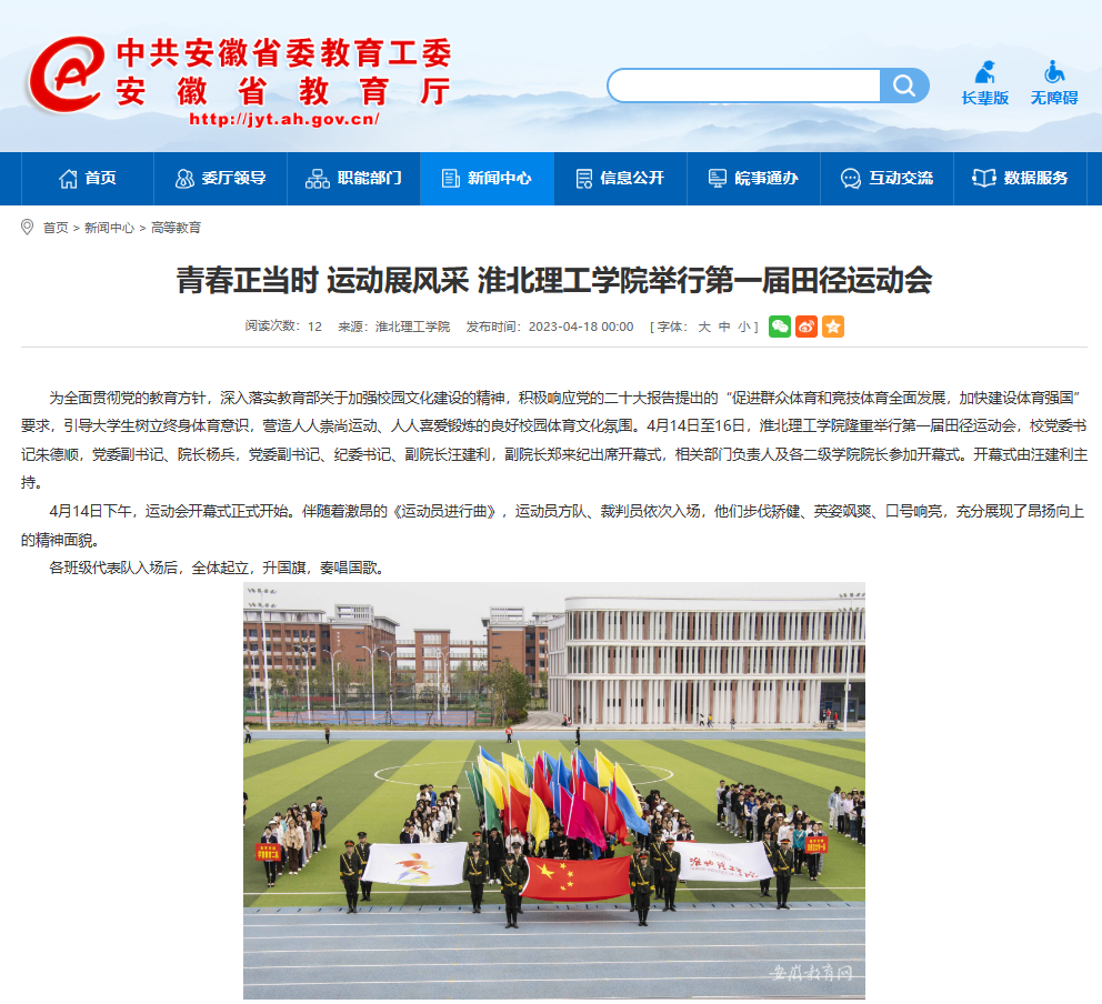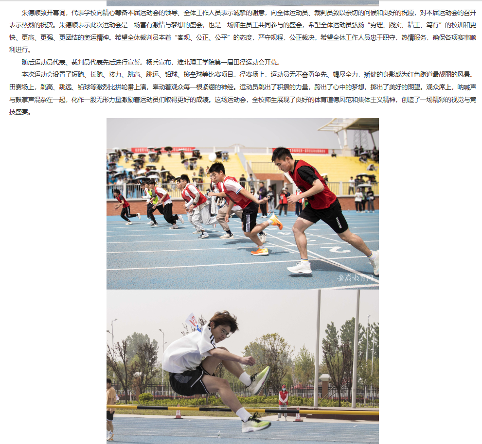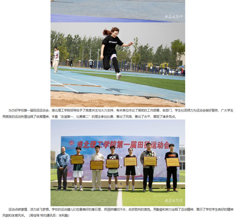 为全面贯彻德、智、体、美、劳全面发展的教育方针,深入贯彻落实教育部关于加强校园文化建设的精神,积极响应党的二十大报告提出的“促进群众体育和竞技体育全面发展,加快建设体育强国”的要求,引导大学生树立终身体育意识,营造人人崇尚运动、人人喜爱锻炼的良好校园体育文化氛围,学校于4月14日至16日隆重举行第一届田径运动会。对此,安徽教育网进行了报道: