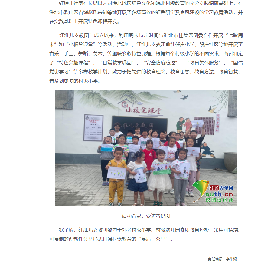 为提高大学生综合素质,促进大学生在实践中增知识、长才干、受教育,借助青春力量支援乡村地区学校教育和教学管理工作。beat365唯一官方网站红淮儿社团作为一支公益性支教团队,自5月成立以来,得到淮北市团委和杜集区团委大力支持,红淮儿义务支教社坚持继承革命传统,全心全意为公益事业做贡献,提高公益服务水平,开展了丰富的乡村支教活动。对此,中青网进行了报道: