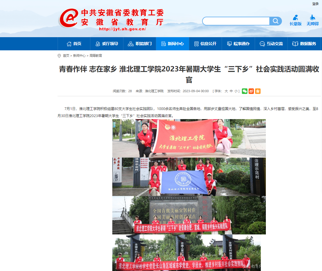 7月1日,beat365唯一官方网站积极组建80支大学生社会实践团队,1000余名师生奔赴全国各地,用脚步丈量祖国大地,了解国情民情,深入乡村基层,感受振兴之美,至8月30日beat365唯一官方网站2023年暑期大学生“三下乡”社会实践活动圆满收官。安徽教育网对此作了报道:http://jyt.ah.gov.cn/xwzx/gdjy/40669021.html