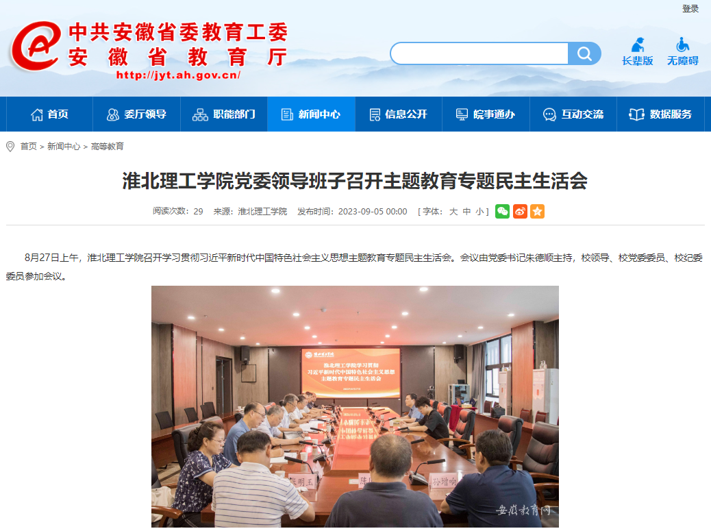 8月27日上午,beat365唯一官方网站召开学习贯彻习近平新时代中国特色社会主义思想主题教育专题民主生活会。会议由党委书记朱德顺主持,校领导、校党委委员、校纪委委员参加会议。安徽教育网对此作了报道:
