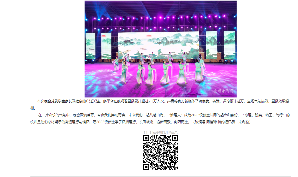 星光点亮梦想,青春扬帆起航。11月8日晚,“心‘淮’理想·逐梦启航”beat365唯一官方网站2023年迎新晚会在体育场隆重举行。对此,安徽教育网进行了报道: