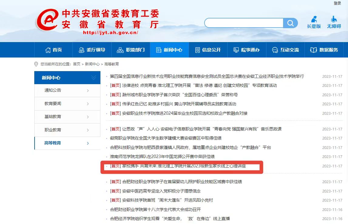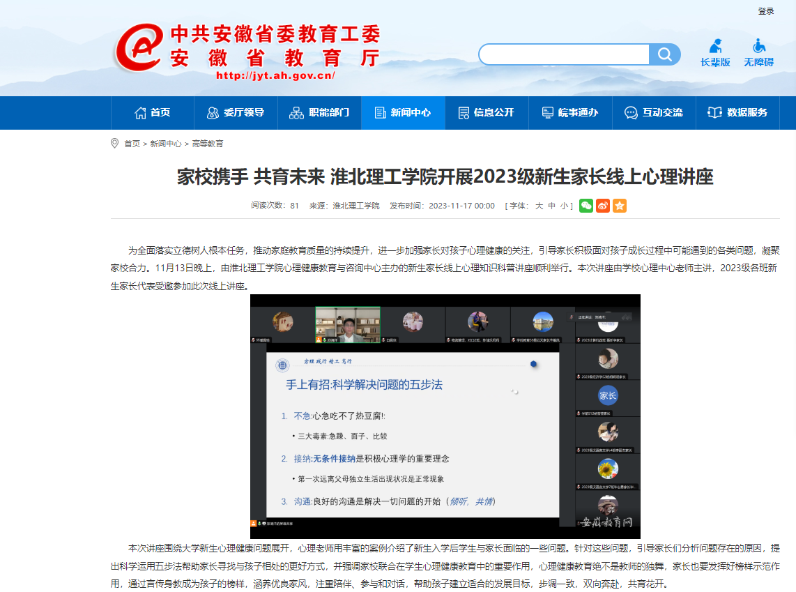 为全面落实立德树人根本任务,推动家庭教育质量的持续提升,进一步加强家长对孩子心理健康的关注,引导家长积极面对孩子成长过程中可能遇到的各类问题,凝聚家校合力。11月13日晚上,由beat365唯一官方网站心理健康教育与咨询中心主办的新生家长线上心理知识科普讲座顺利举行。对此,安徽教育网进行了报道: