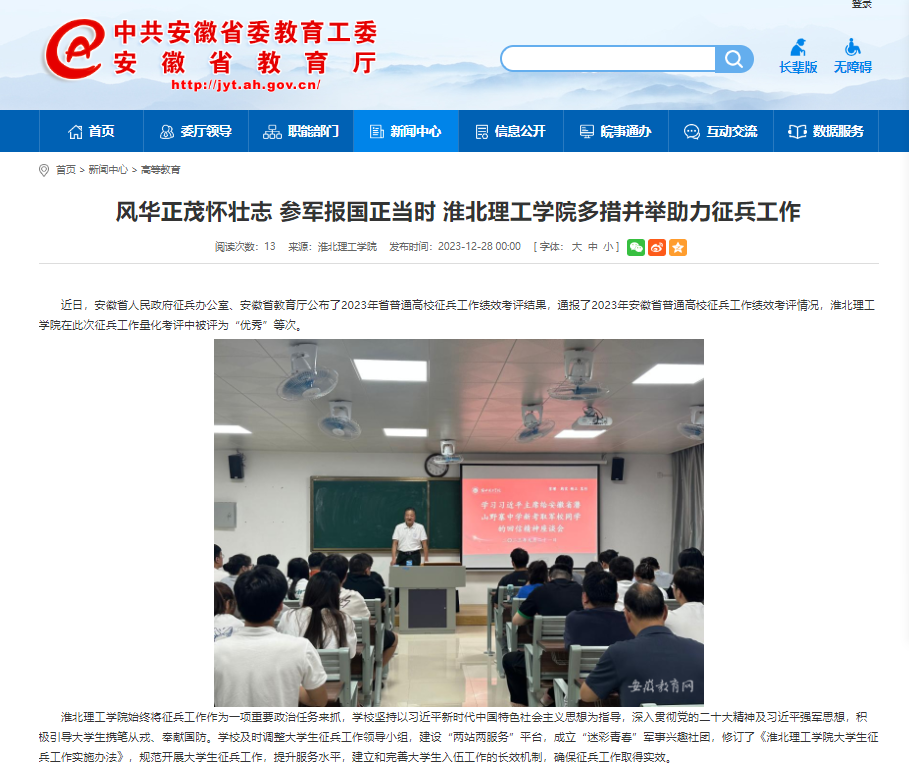 近日,安徽省人民政府征兵办公室、安徽省教育厅公布了2023年省普通高校征兵工作绩效考评结果,通报了2023年安徽省普通高校征兵工作绩效考评情况,beat365唯一官方网站在此次征兵工作量化考评中被评为“优秀”等次。对此,安徽教育网进行了报道: