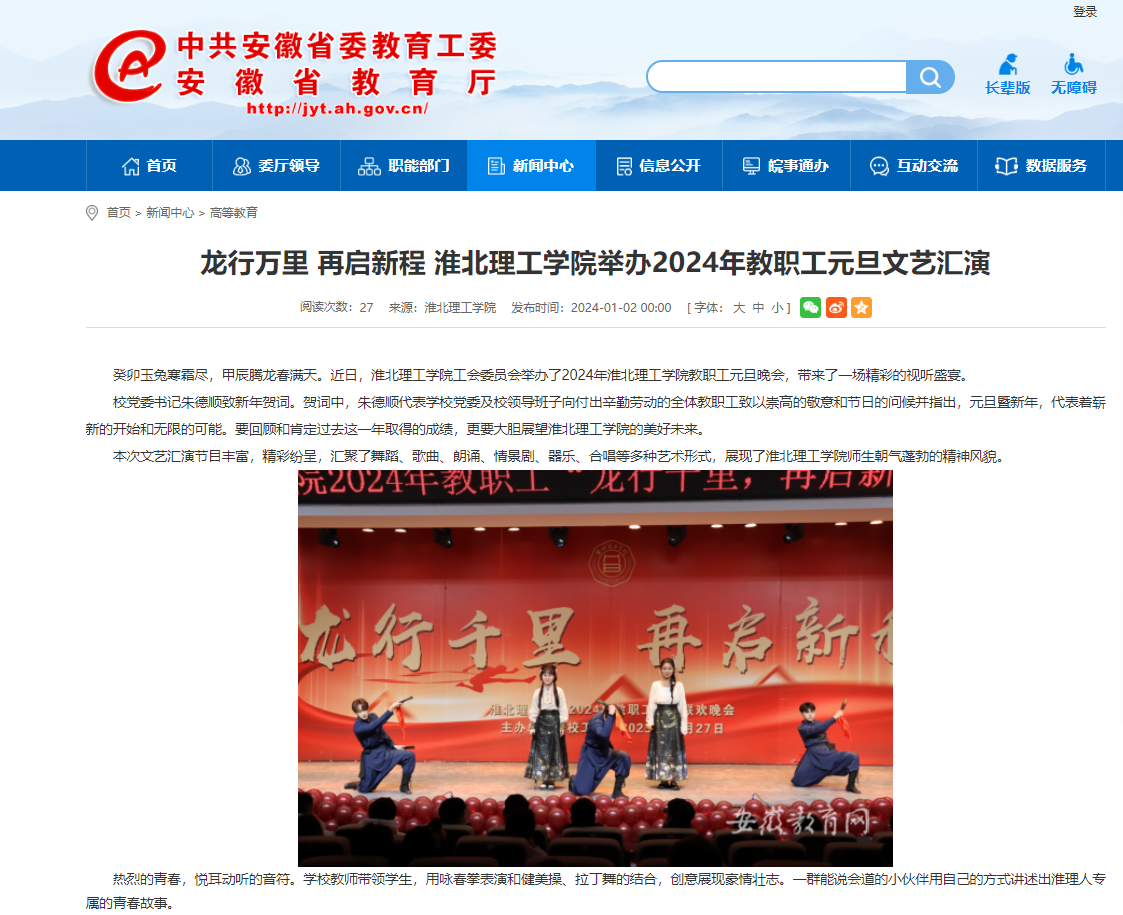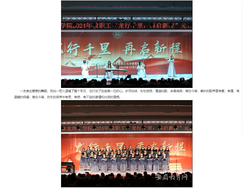 癸卯玉兔寒霜尽,甲辰腾龙春满天。近日,beat365唯一官方网站工会委员会举办了2024年beat365唯一官方网站教职工元旦晚会,带来了一场精彩的视听盛宴。对此,安徽教育网进行了报道: