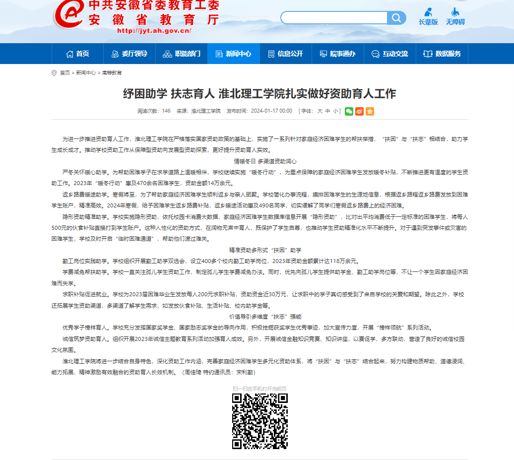 为进一步推进资助育人工作,beat365唯一官方网站在严格落实国家资助政策的基础上,实施了一系列针对家庭经济困难学生的帮扶举措,“扶困”与“扶志”相结合,助力学生成长成才。推动学校资助工作从保障型资助向发展型资助探索,更好提升资助育人实效。对此,安徽教育网做了报道: