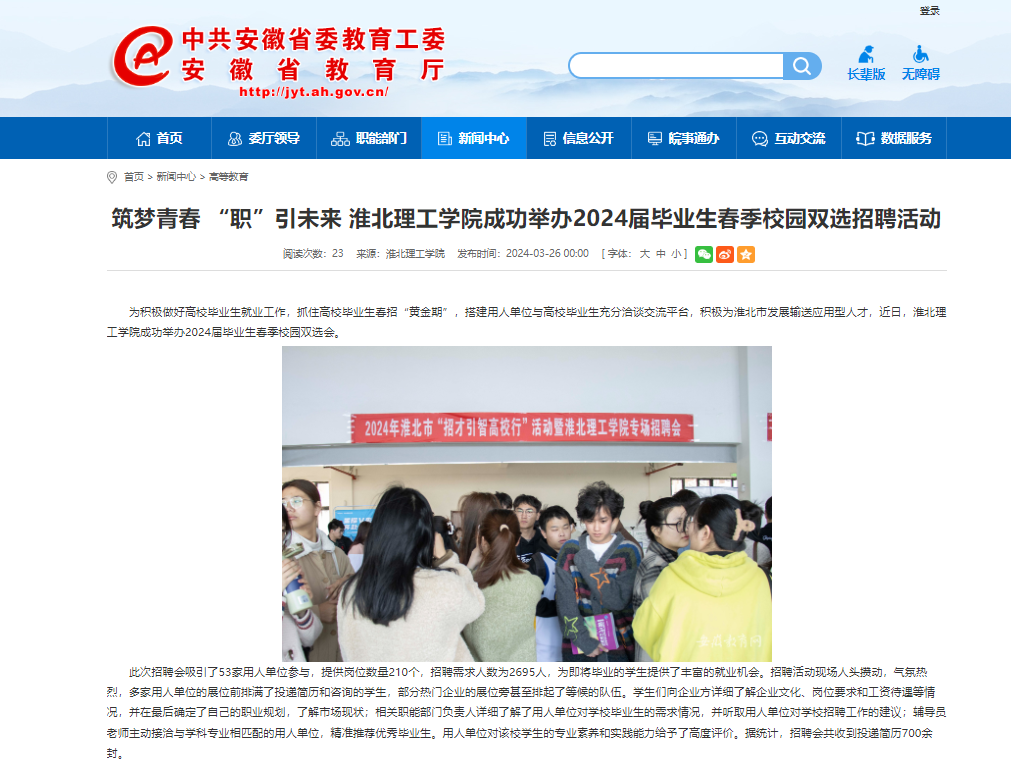 为积极做好高校毕业生就业工作,抓住高校毕业生春招“黄金期”,搭建用人单位与高校毕业生充分洽谈交流平台,积极为淮北市发展输送应用型人才,近日,beat365唯一官方网站成功举办2024届毕业生春季校园双选会。对此,安徽教育网进行了报道:
