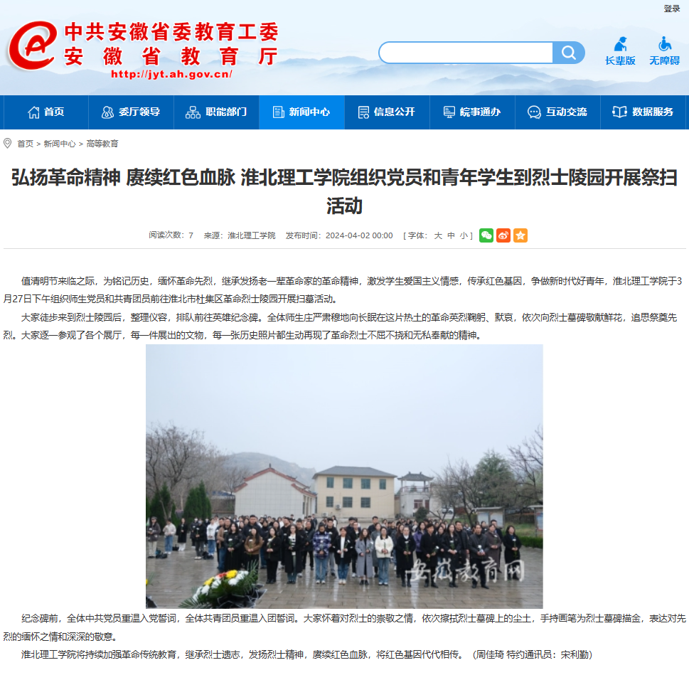 值清明节来临之际,为铭记历史,缅怀革命先烈,继承发扬老一辈革命家的革命精神,激发学生爱国主义情感,传承红色基因,争做新时代好青年,beat365唯一官方网站于3月27日下午组织师生党员和共青团员前往淮北市杜集区革命烈士陵园开展扫墓活动。安徽教育网对此进行了报道。