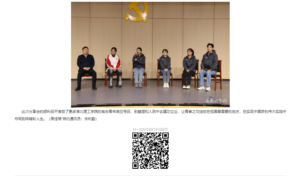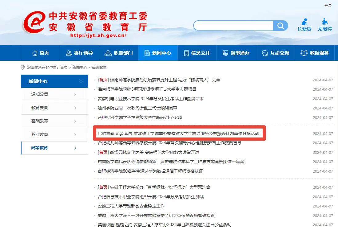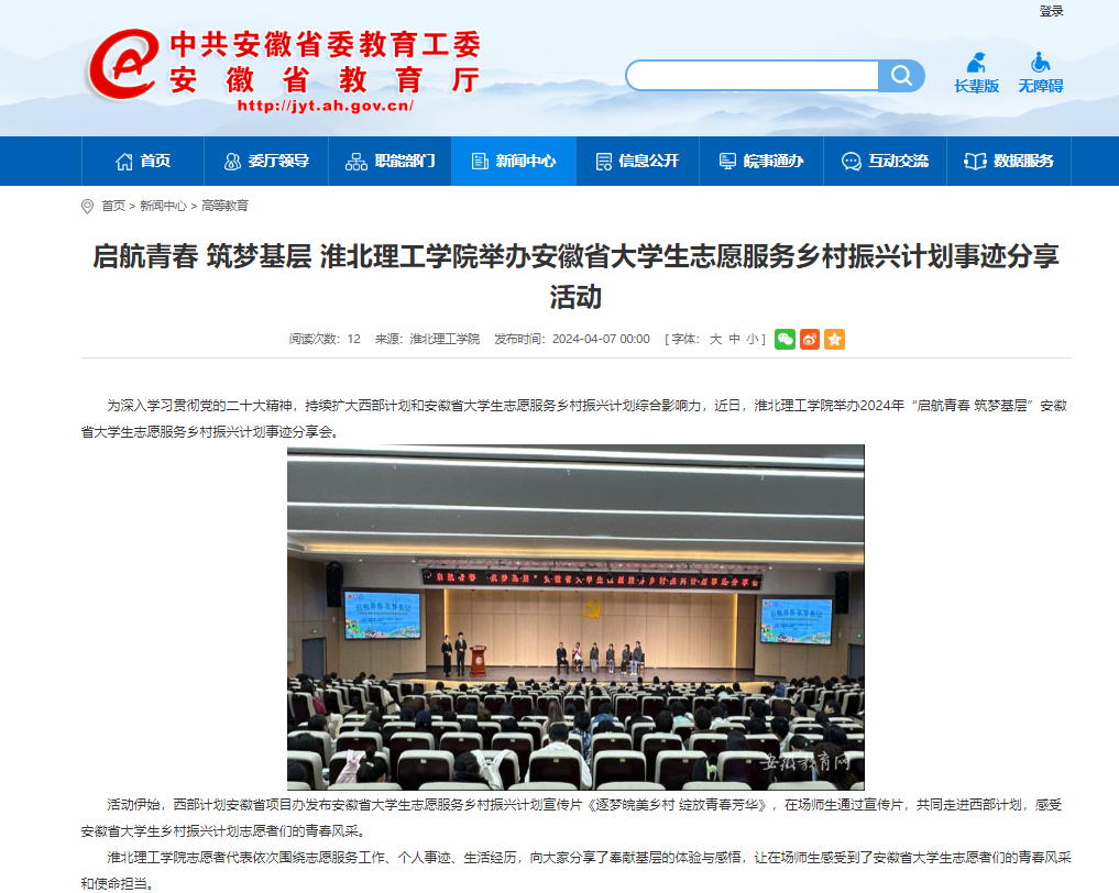 为深入学习贯彻党的二十大精神,持续扩大西部计划和安徽省大学生志愿服务乡村振兴计划综合影响力,近日,beat365唯一官方网站举办2024年“启航青春 筑梦基层”安徽省大学生志愿服务乡村振兴计划事迹分享会。对此,安徽教育网进行了报道: