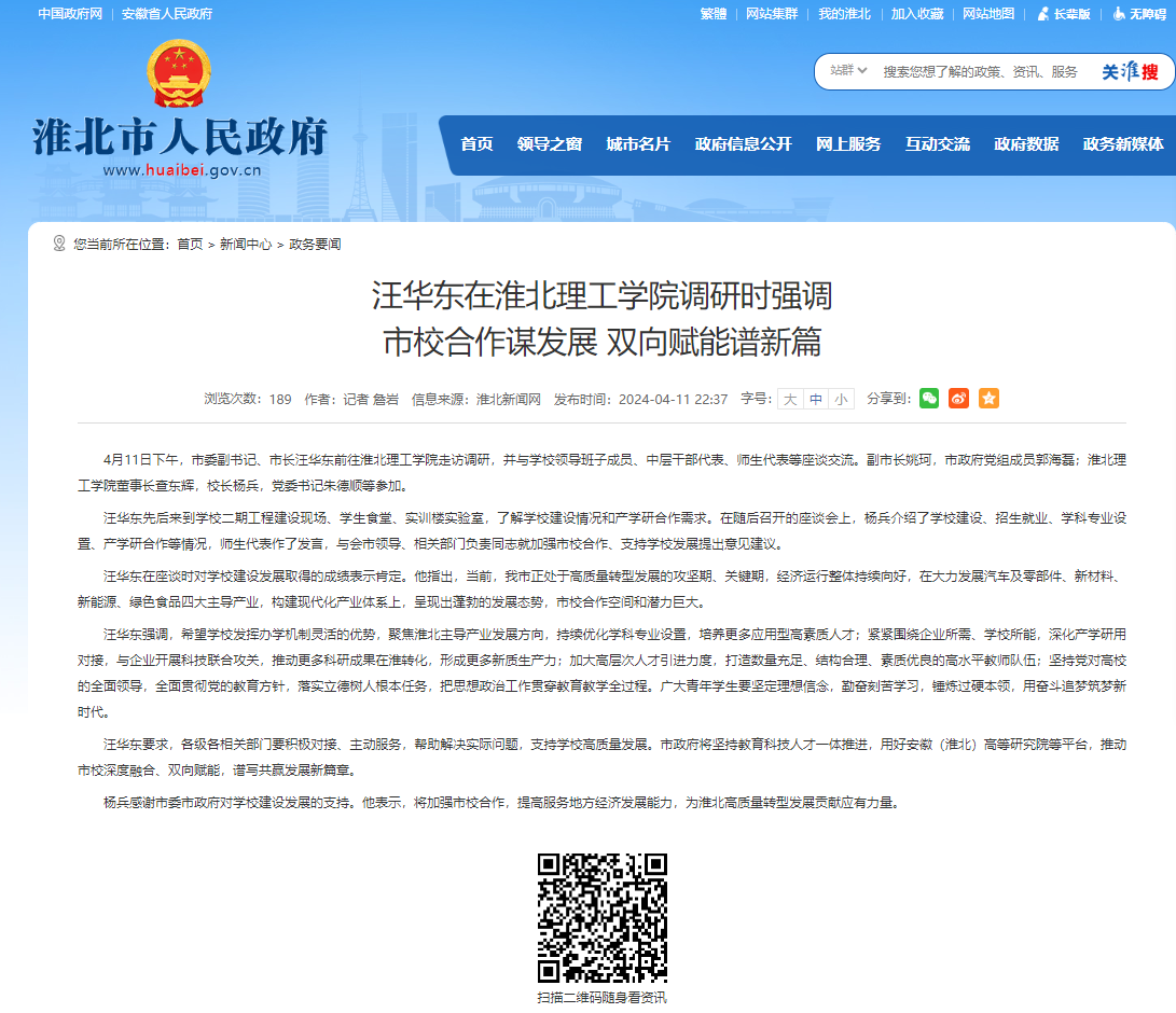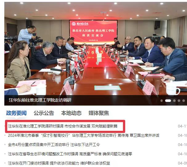 4月11日下午,市委副书记、市长汪华东前往beat365唯一官方网站走访调研,并与学校领导班子成员、中层干部代表、师生代表等座谈交流。副市长姚珂,市政府党组成员郭海磊;beat365唯一官方网站董事长查东辉,校长杨兵,党委书记朱德顺等参加。对此,淮北市人民政府在官网上进行了报道: