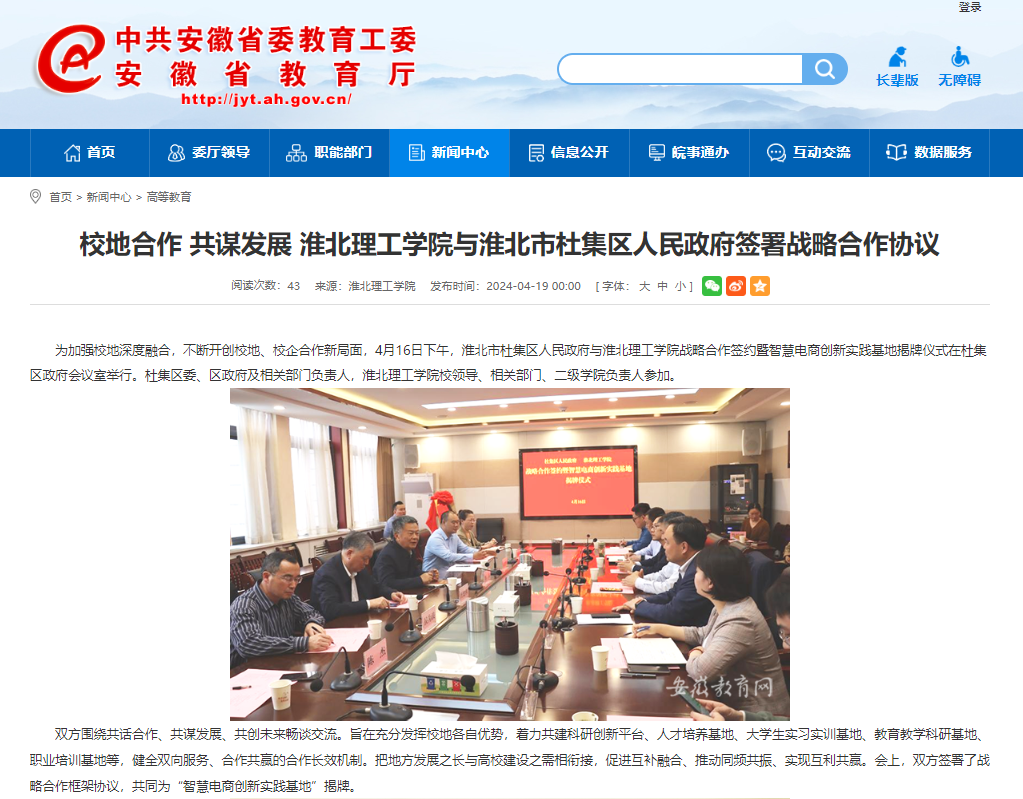 为加强校地深度融合,不断开创校地、校企合作新局面,4月16日下午,淮北市杜集区人民政府与beat365唯一官方网站战略合作签约暨智慧电商创新实践基地揭牌仪式在杜集区政府会议室举行。杜集区委、区政府及相关部门负责人,beat365唯一官方网站校领导、相关部门、二级学院负责人参加。对此,安徽教育网进行报道: