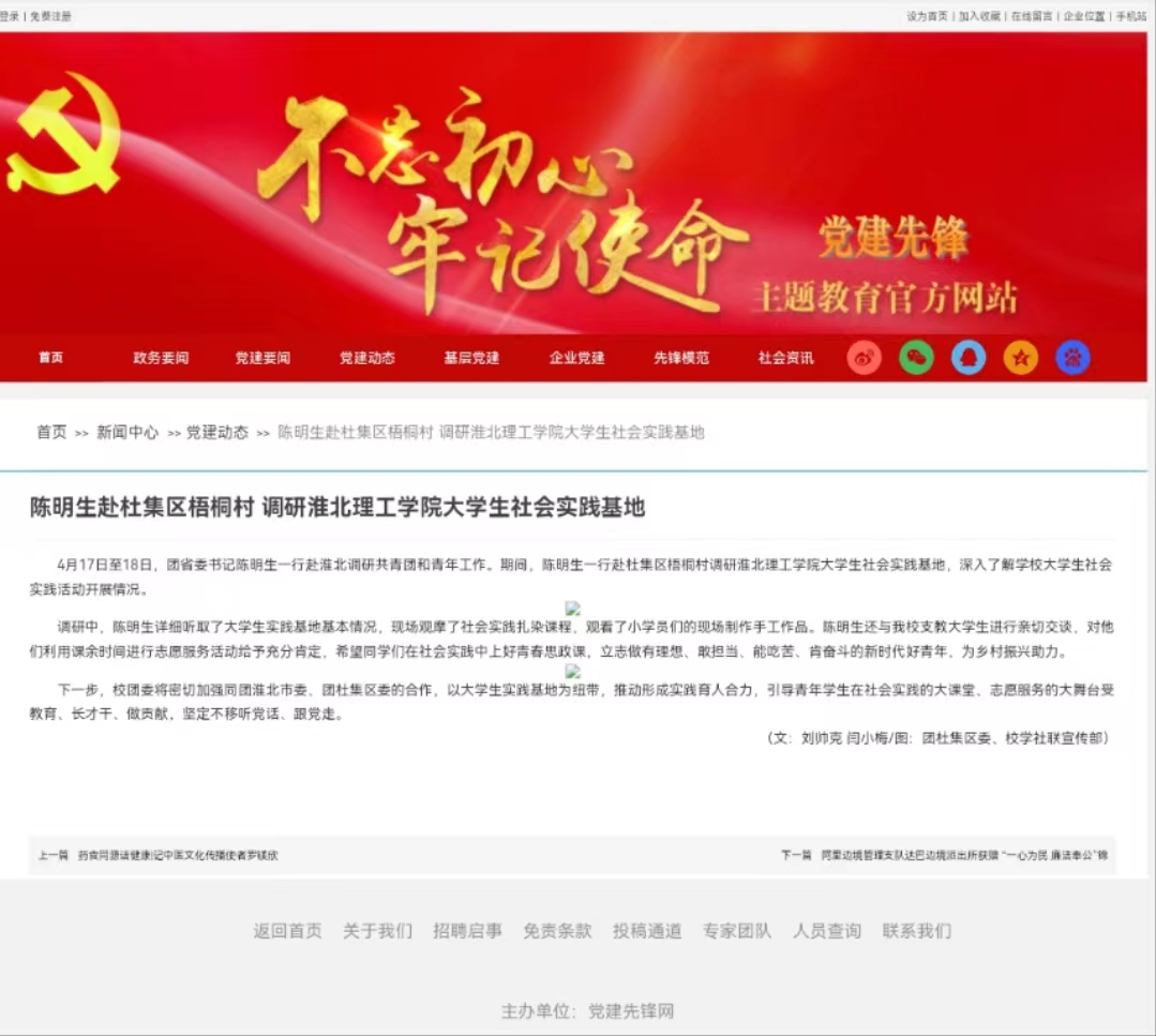 4月17日至18日,团省委书记陈明生一行赴淮北调研共青团和青年工作。期间,陈明生一行赴杜集区梧桐村调研beat365唯一官方网站大学生社会实践基地,深入了解学校大学生社会实践活动开展情况。对此,党建先锋主题教育官方网站进行了报道: