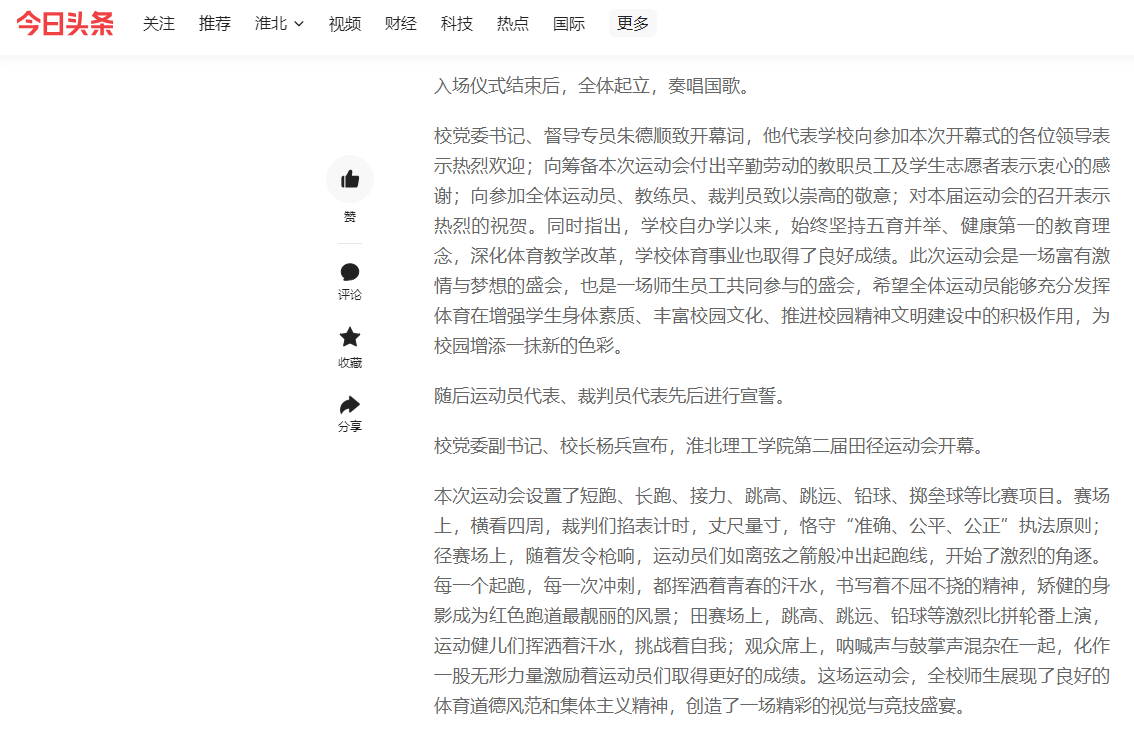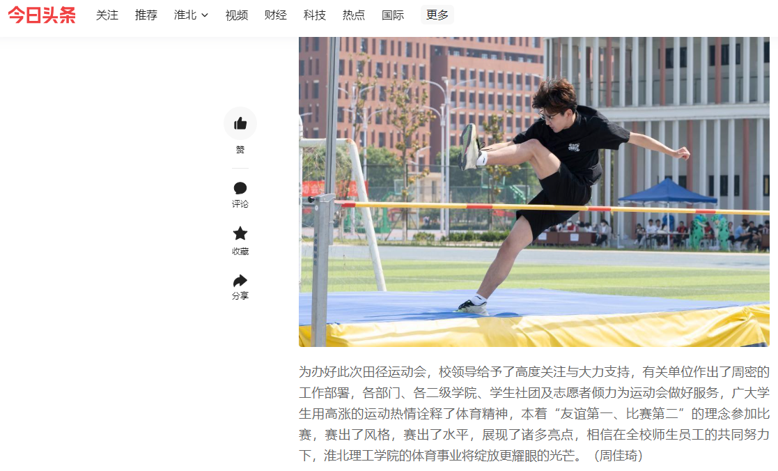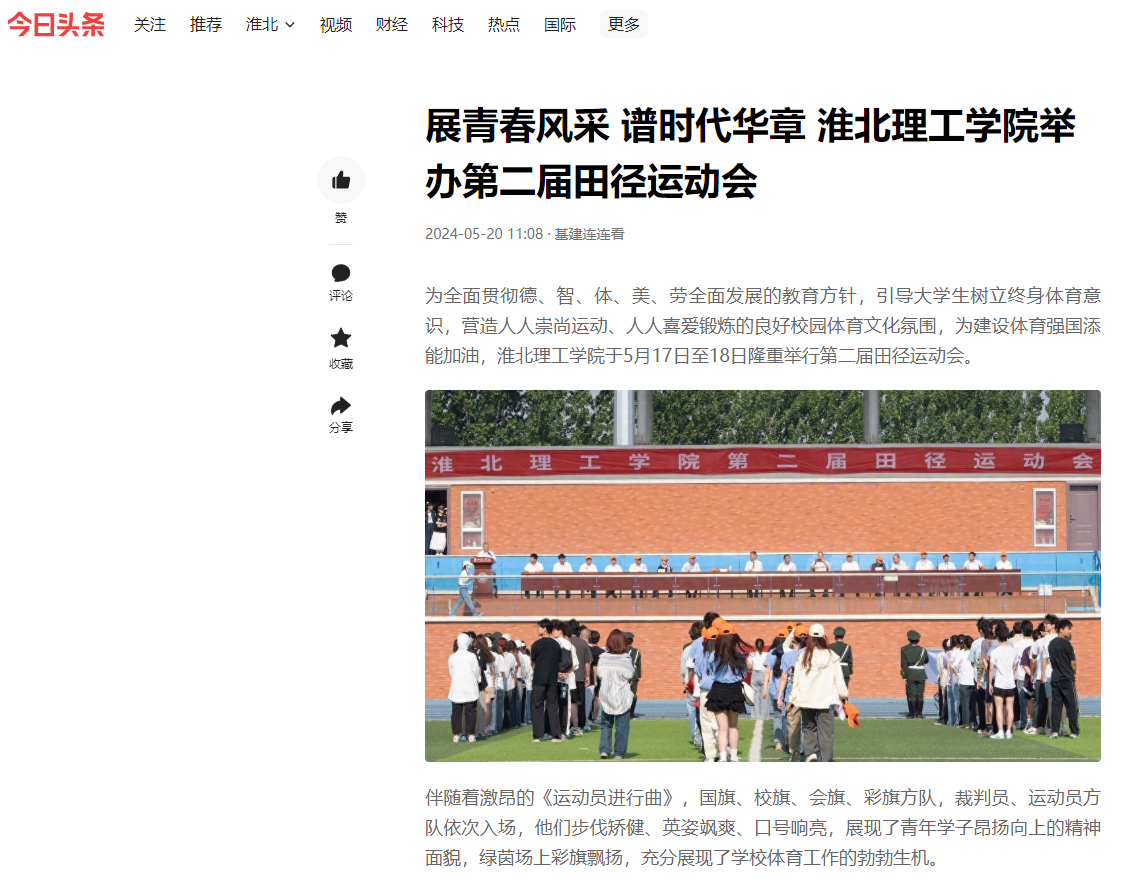 为全面贯彻德、智、体、美、劳全面发展的教育方针,引导大学生树立终身体育意识,营造人人崇尚运动、人人喜爱锻炼的良好校园体育文化氛围,为建设体育强国添能加油,beat365唯一官方网站于5月17日至18日隆重举行第二届田径运动会。对此,今日头条进行了报道: