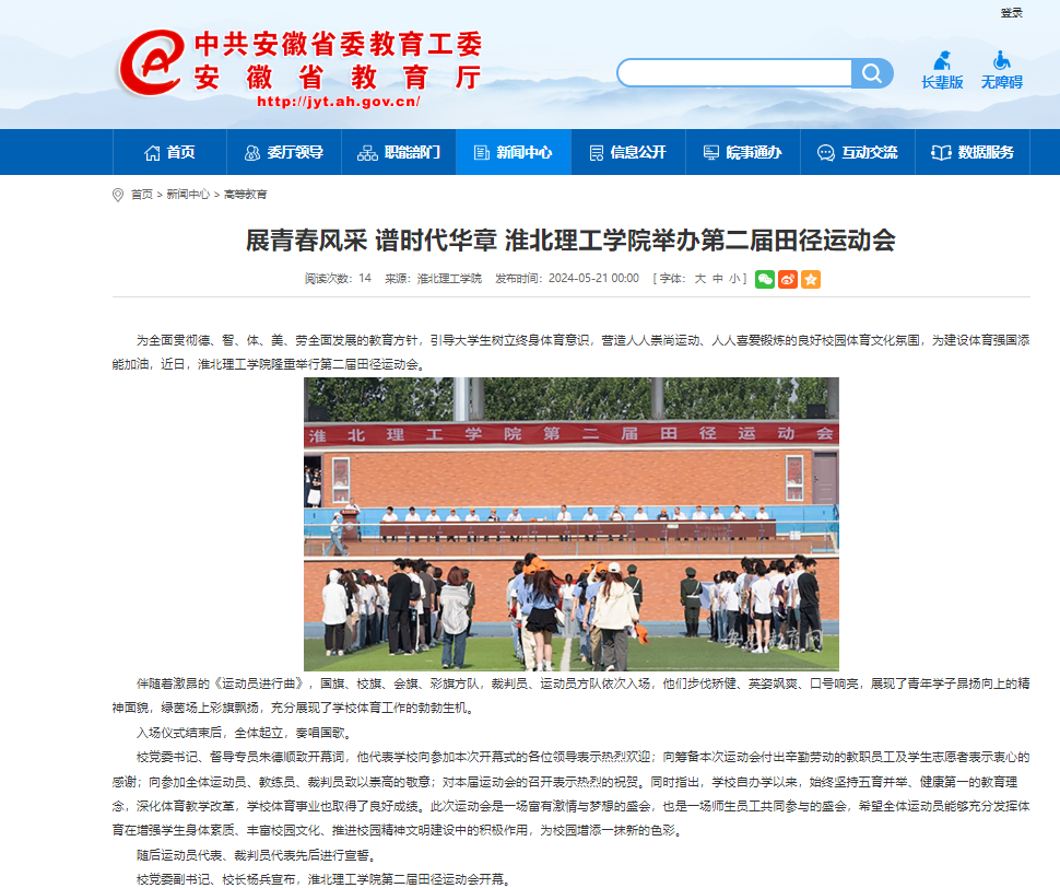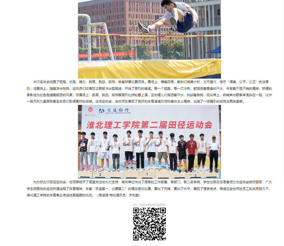 为全面贯彻德、智、体、美、劳全面发展的教育方针,引导大学生树立终身体育意识,营造人人崇尚运动、人人喜爱锻炼的良好校园体育文化氛围,为建设体育强国添能加油,近日,beat365唯一官方网站隆重举行第二届田径运动会。对此,安徽教育网进行了报道: