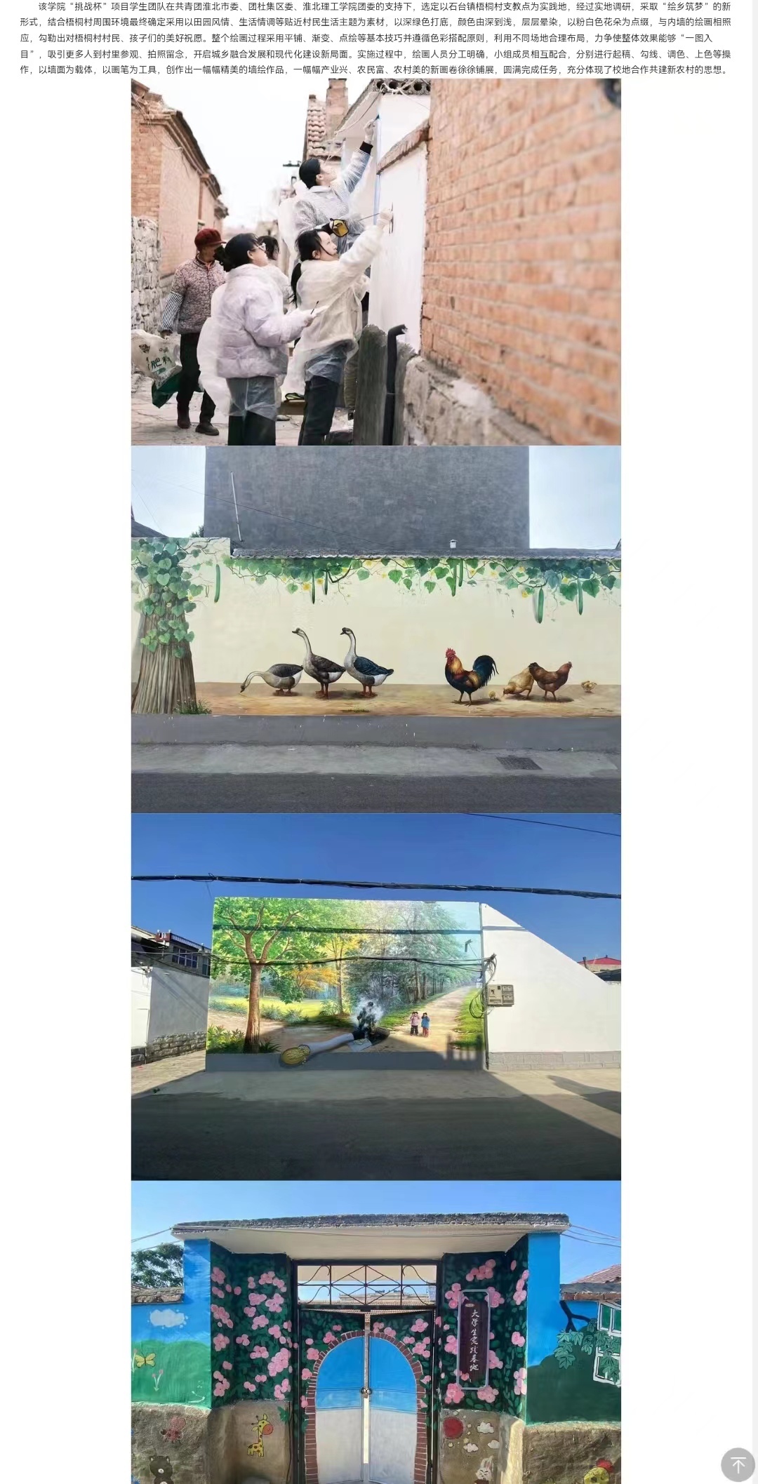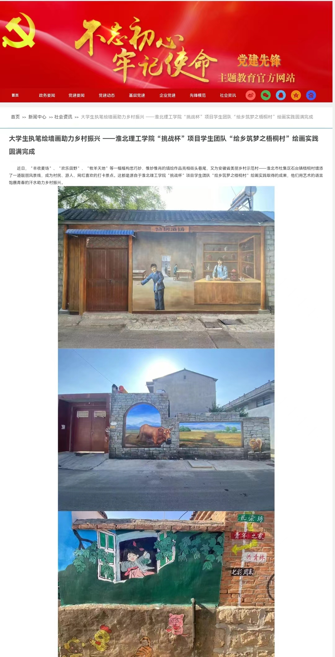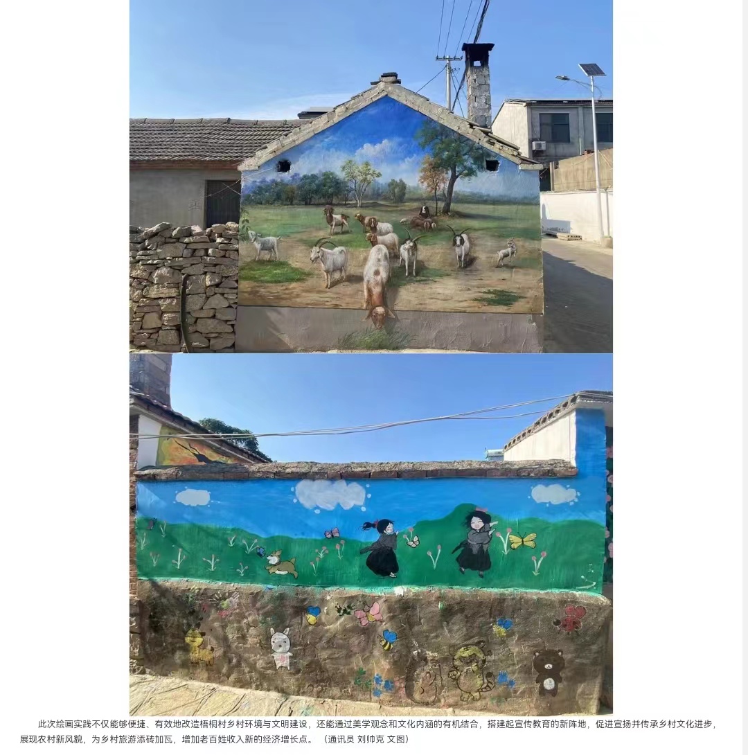近日,“丰收麦场”、“欢乐田野”、“牧羊天地”等一幅幅构思巧妙、惟妙惟肖的墙绘作品亮相街头巷尾,又为安徽省美丽乡村示范村——淮北市杜集区石台镇梧桐村增添了一道靓丽风景线,成为村民、游人、网红喜欢的打卡景点。这都是源自于beat365唯一官方网站“挑战杯”项目学生团队“绘乡筑梦之梧桐村”绘画实践取得的成果,他们用艺术的语言饱蘸青春的汗水助力乡村振兴。对此,党建先锋 主题教育官方网站进行了报道:
