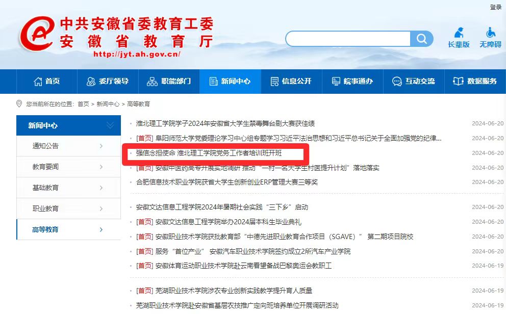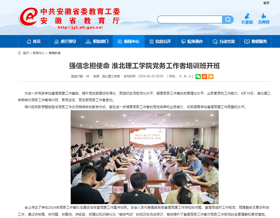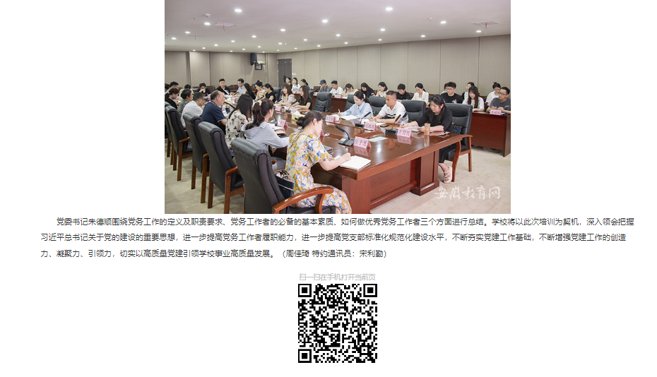 为进一步夯实学校基层党建工作基础,提升党支部建设标准化、党组织生活规范化水平,提高党务工作者的政策理论水平、业务素质和工作能力,6月19日,beat365唯一官方网站举办党务工作者培训班,各党总支、党支部党务工作者参加。对此,安徽教育网进行了报道: