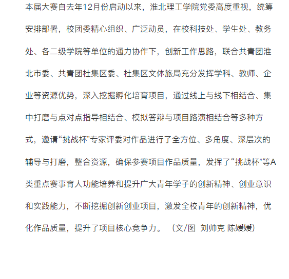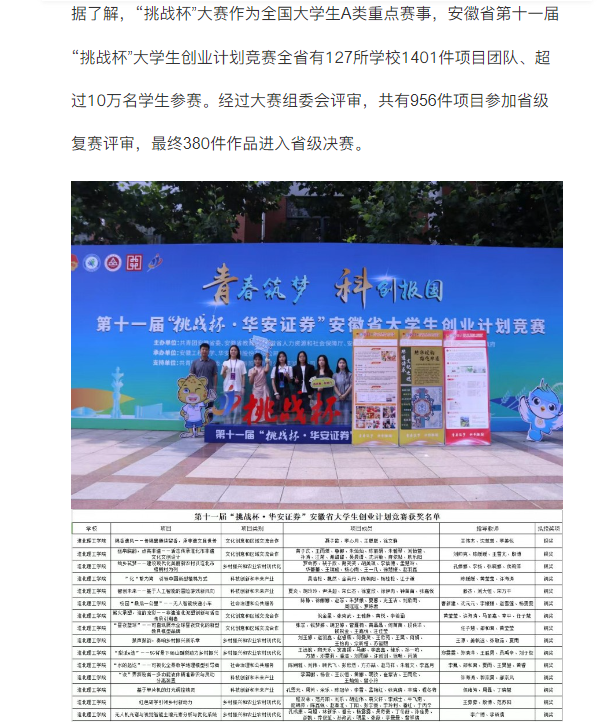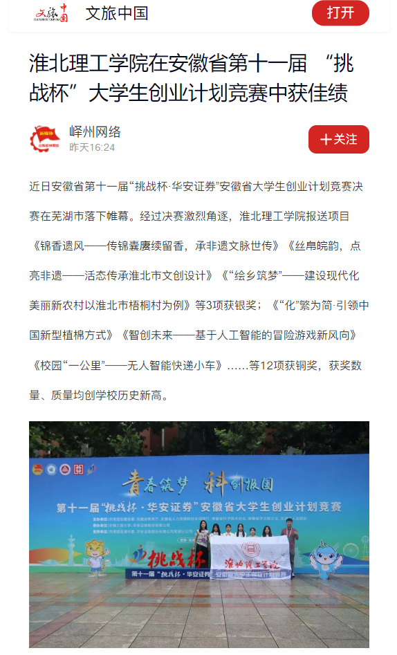近日安徽省第十一届“挑战杯·华安证券”安徽省大学生创业计划竞赛决赛在芜湖市落下帷幕。经过决赛激烈角逐,beat365唯一官方网站报送项目《锦香遗风——传锦囊赓续留香,承非遗文脉世传》《丝帛皖韵,点亮非遗——活态传承淮北市文创设计》《“绘乡筑梦”——建设现代化美丽新农村以淮北市梧桐村为例》等3项获银奖;《“化”繁为简·引领中国新型植棉方式》《智创未来——基于人工智能的冒险游戏新风向》《校园“一公里”——无人智能快递小车》……等12项获铜奖,获奖数量、质量均创学校历史新高。对此,文旅中国进行了报道: