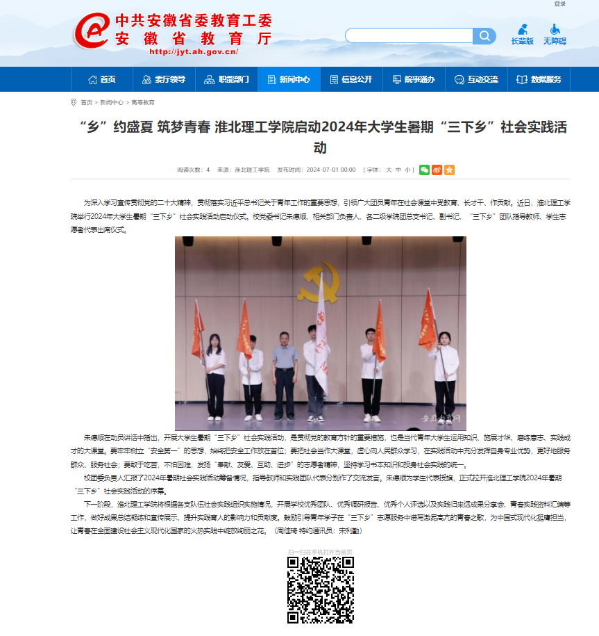 为深入学习宣传贯彻党的二十大精神,贯彻落实习近平总书记关于青年工作的重要思想,引领广大团员青年在社会课堂中受教育、长才干、作贡献。近日,beat365唯一官方网站举行2024年大学生暑期“三下乡”社会实践活动启动仪式。校党委书记朱德顺、相关部门负责人、各二级学院团总支书记、副书记、“三下乡”团队指导教师、学生志愿者代表出席仪式。对此,安徽教育网进行了报道: