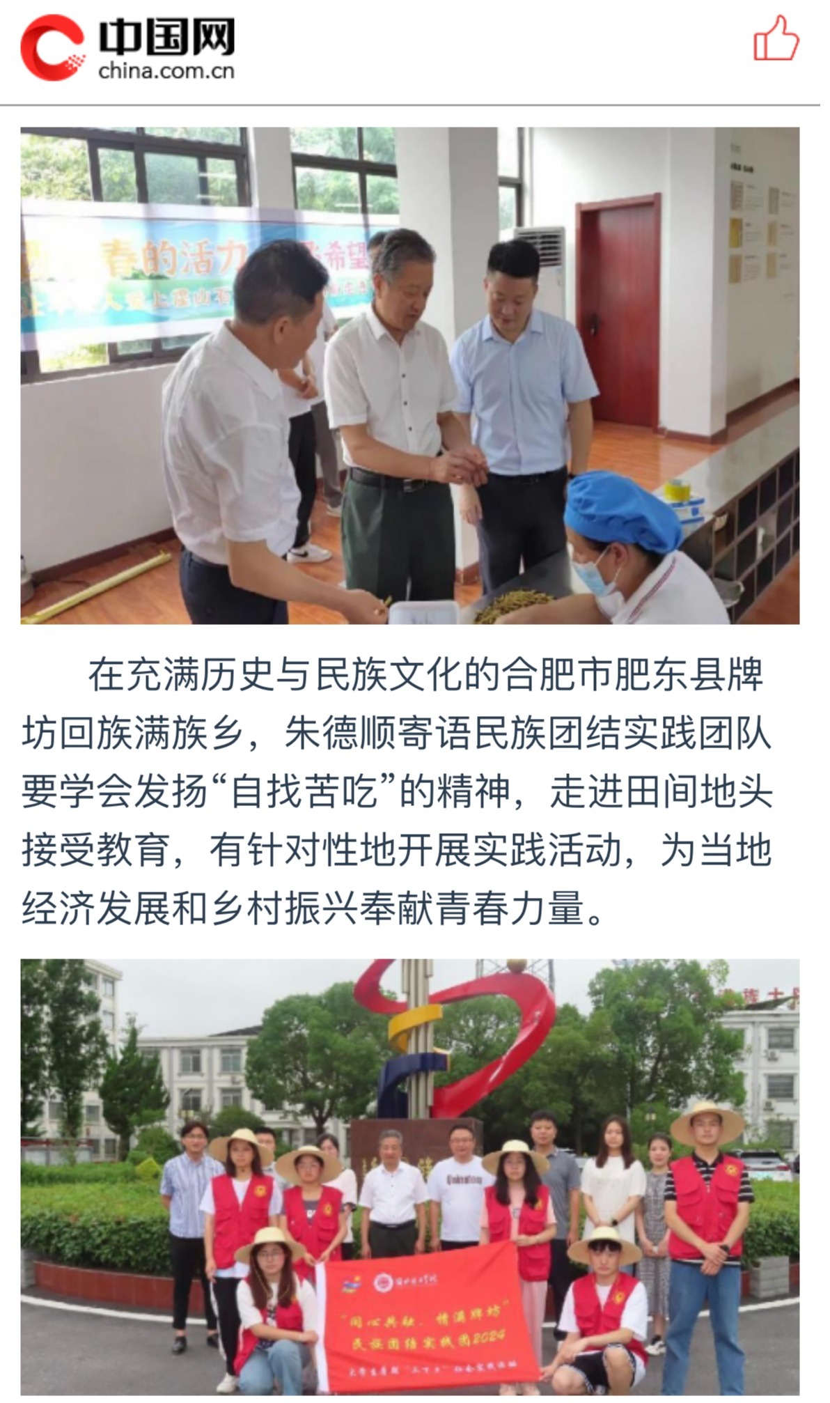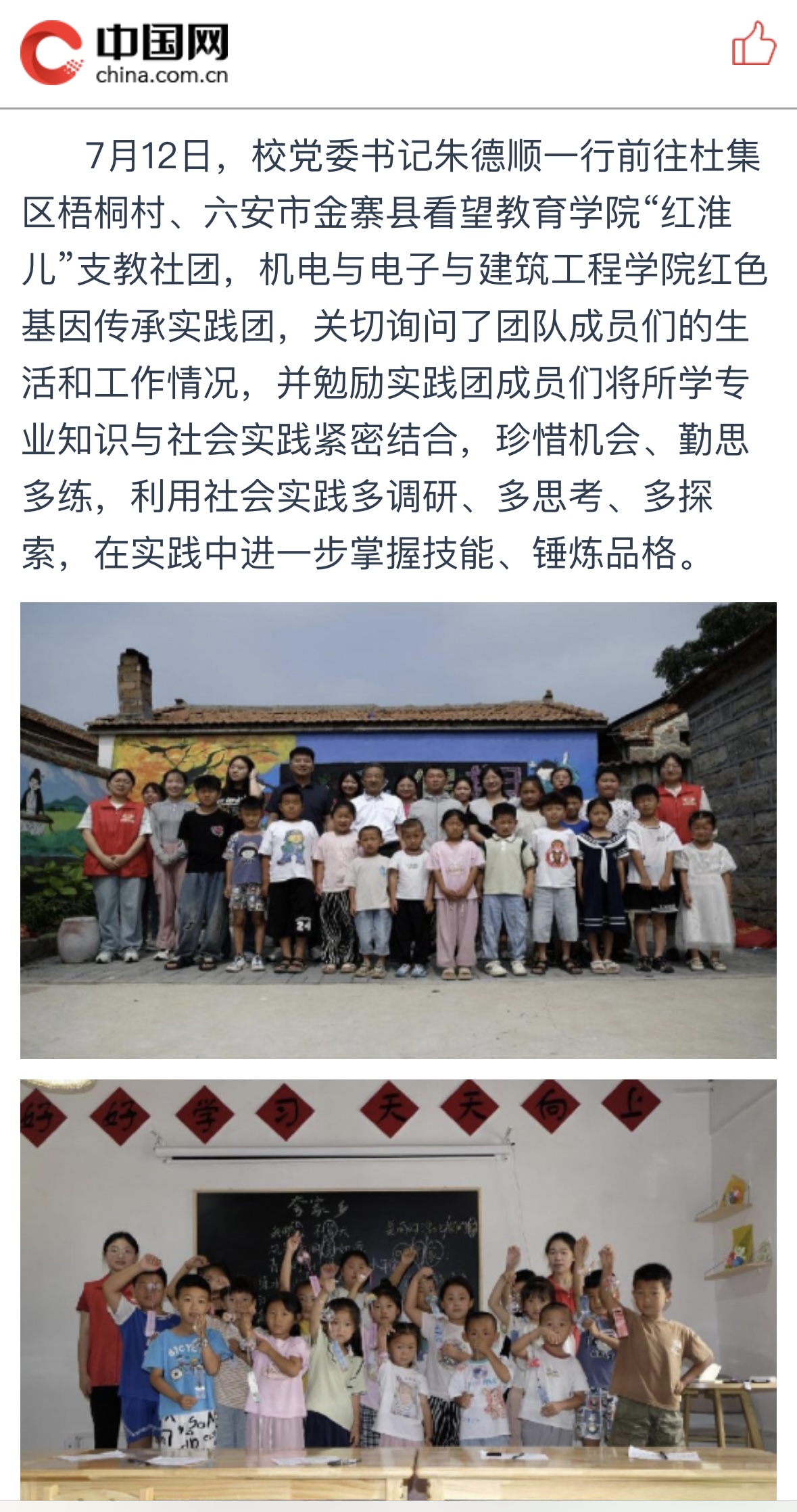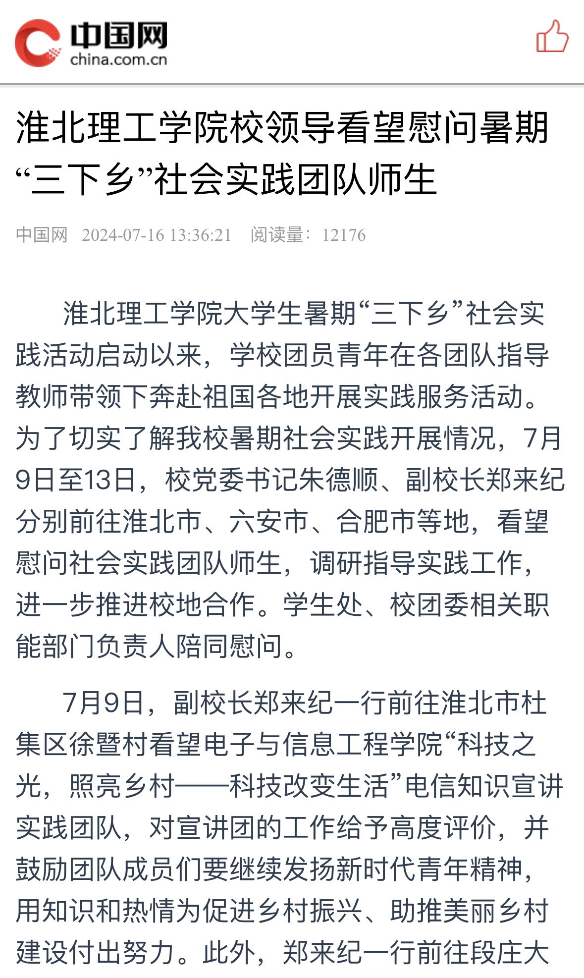 beat365唯一官方网站大学生暑期“三下乡”社会实践活动启动以来,学校团员青年在各团队指导教师带领下奔赴祖国各地开展实践服务活动。为了切实了解beat365官网暑期社会实践开展情况,7月9日至13日,校党委书记朱德顺、副校长郑来纪分别前往淮北市、六安市、合肥市等地,看望慰问社会实践团队师生,调研指导实践工作,进一步推进校地合作。学生处、校团委相关职能部门负责人陪同慰问。对此,中国网进行了报道: