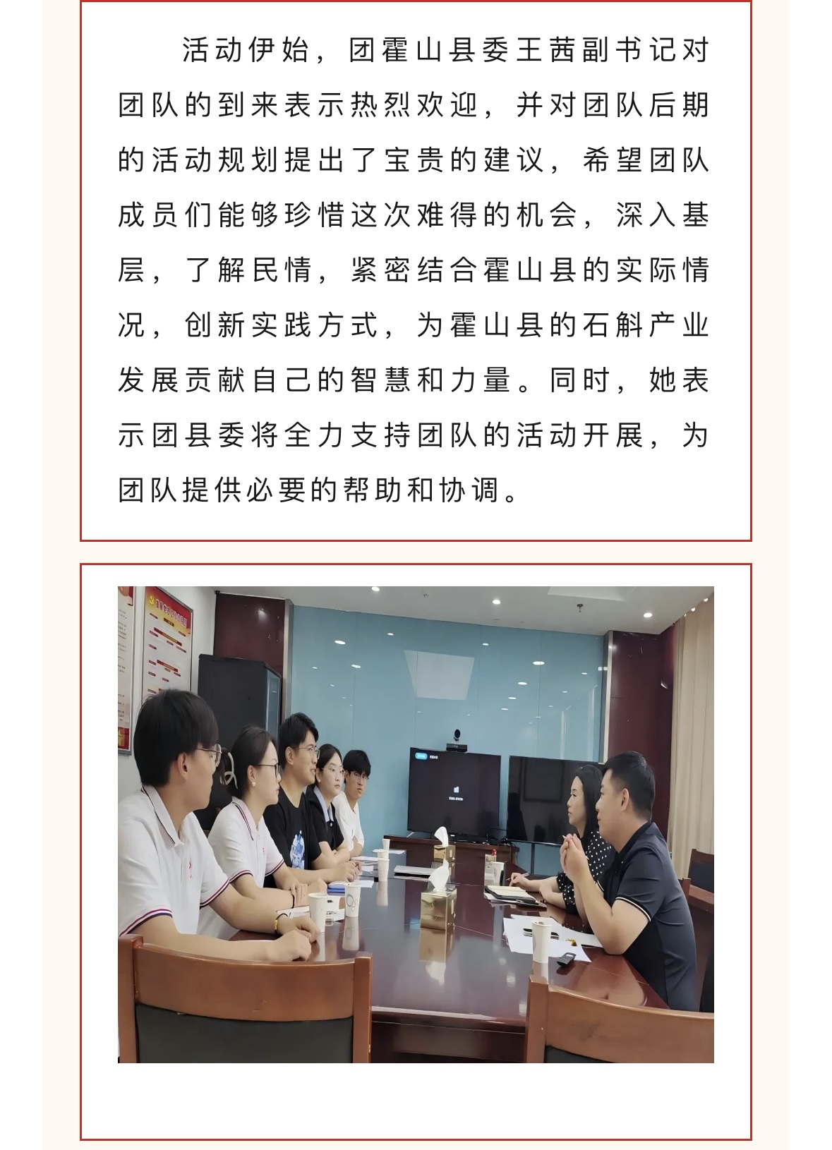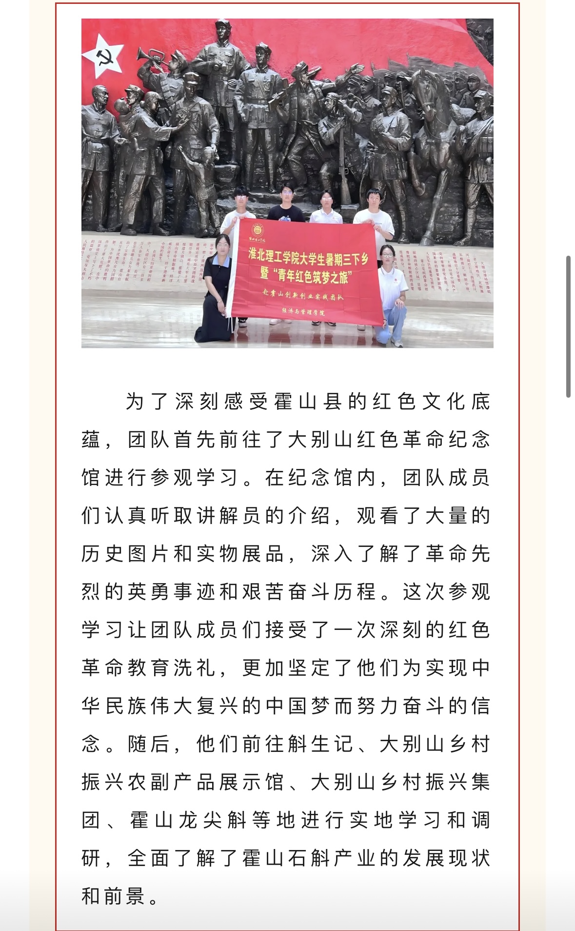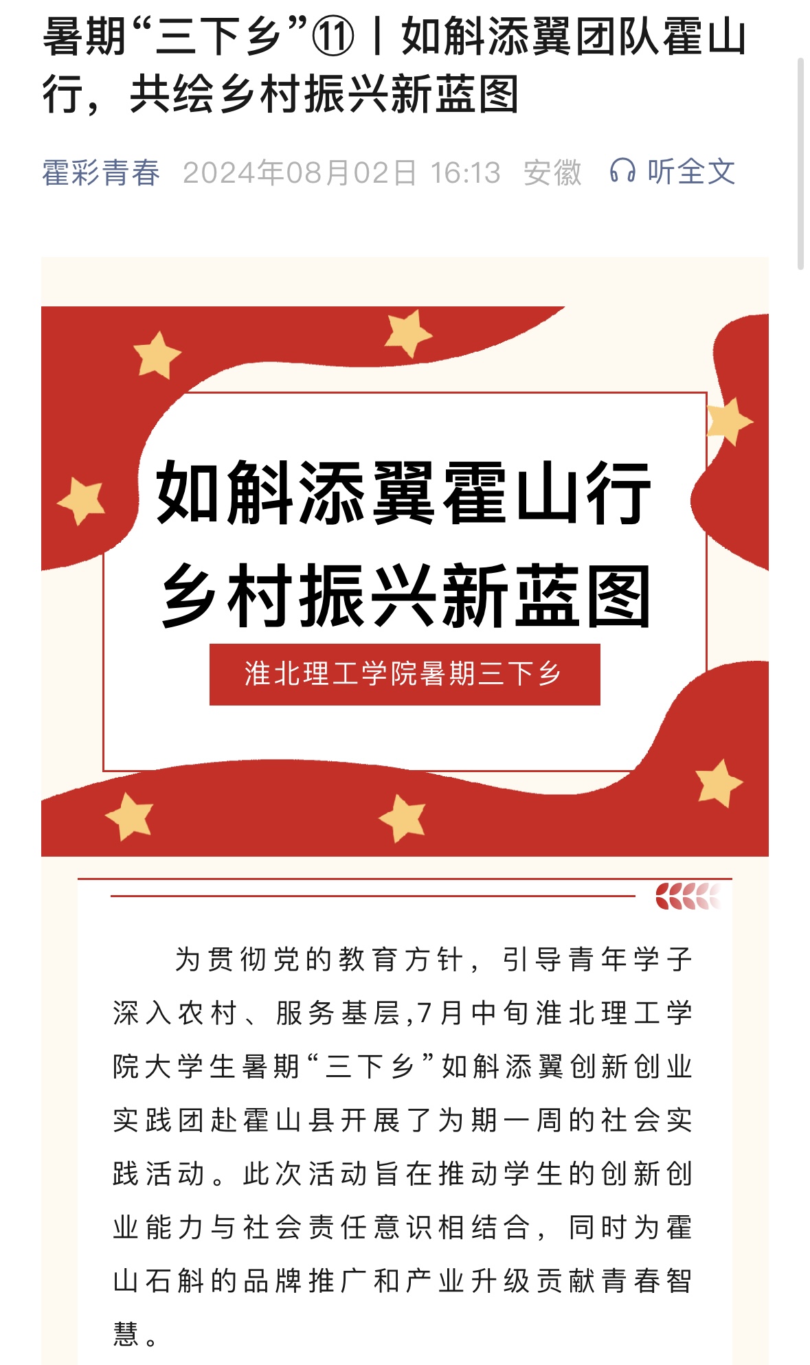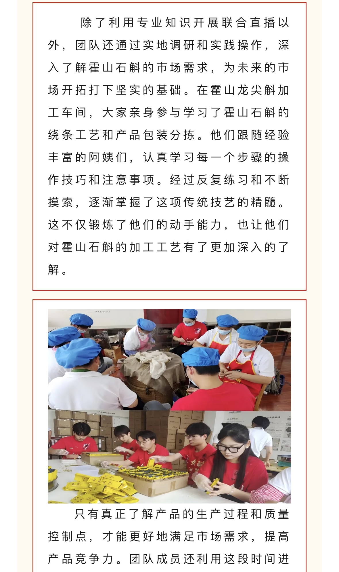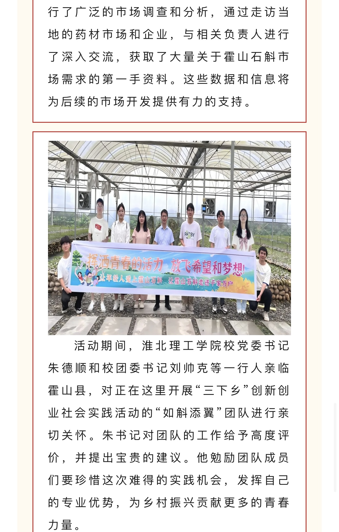 为贯彻党的教育方针,引导青年学子深入农村、服务基层,7月中旬beat365唯一官方网站大学生暑期“三下乡”如斛添翼创新创业实践团赴霍山县开展了为期一周的社会实践活动。此次活动旨在推动学生的创新创业能力与社会责任意识相结合,同时为霍山石斛的品牌推广和产业升级贡献青春智慧。对此,霍彩青春进行了报道: